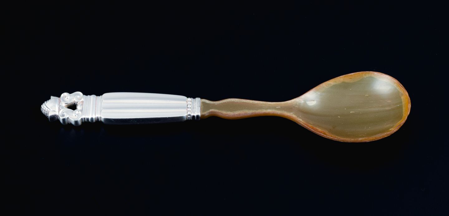 Georg Jensen Konge salatske med laf i horn, middagsgaffel, Cohr flaskeåbner, antik kaffeske, dansk tretårnet Musling strøske fra 1912.