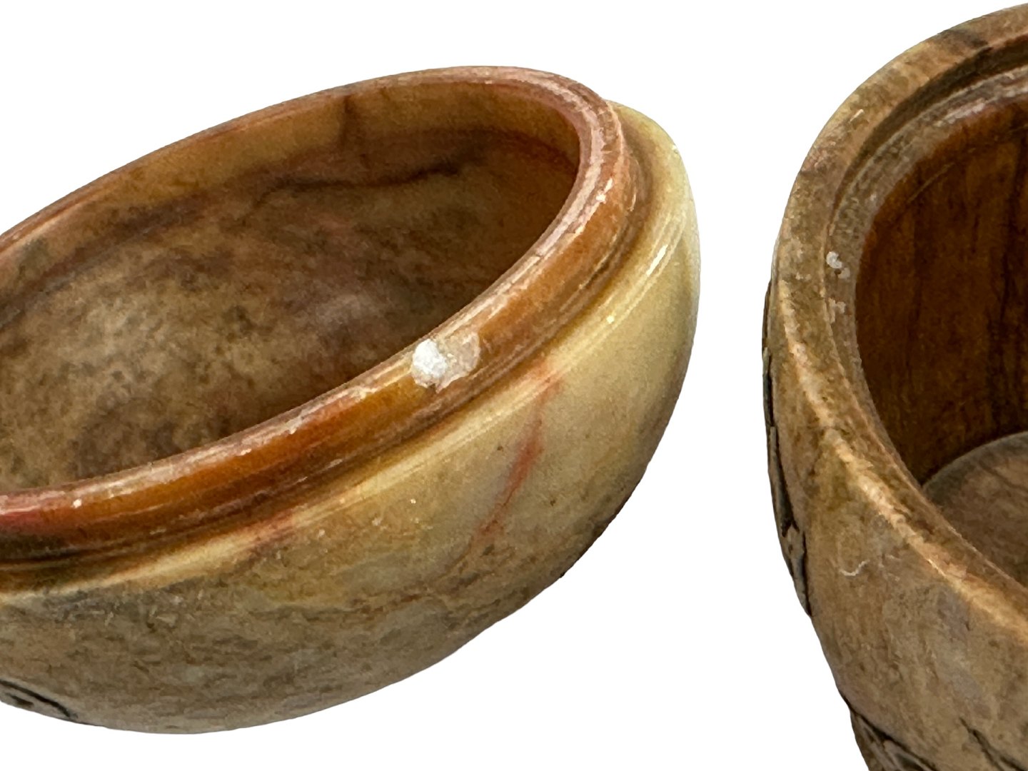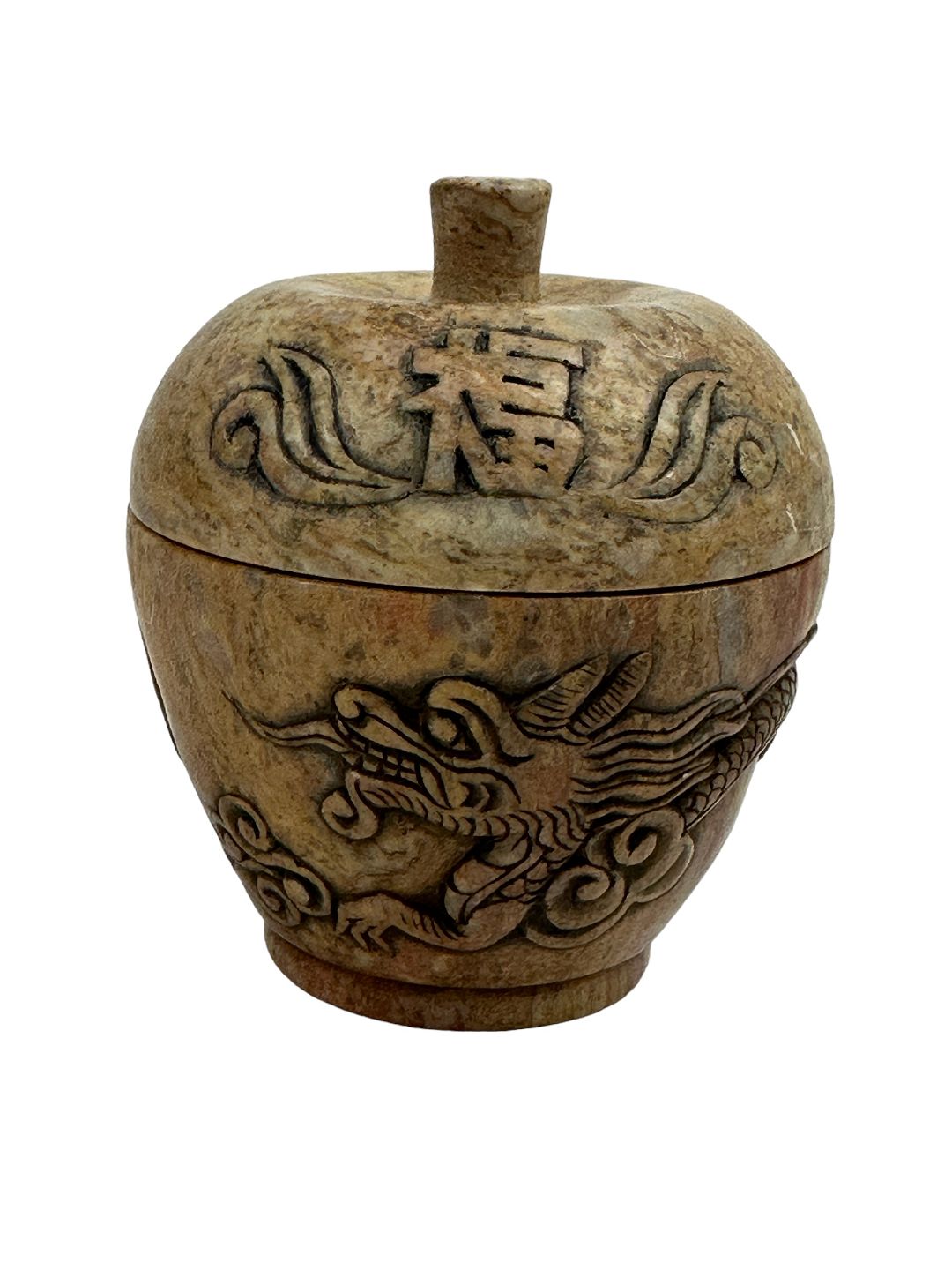 Kinesisk miniature krukke med låg med drage, flammende sol, skriftstegn samt Yin og Yang tegn udskåret i sæbesten. Signeret. 20. århundrede.