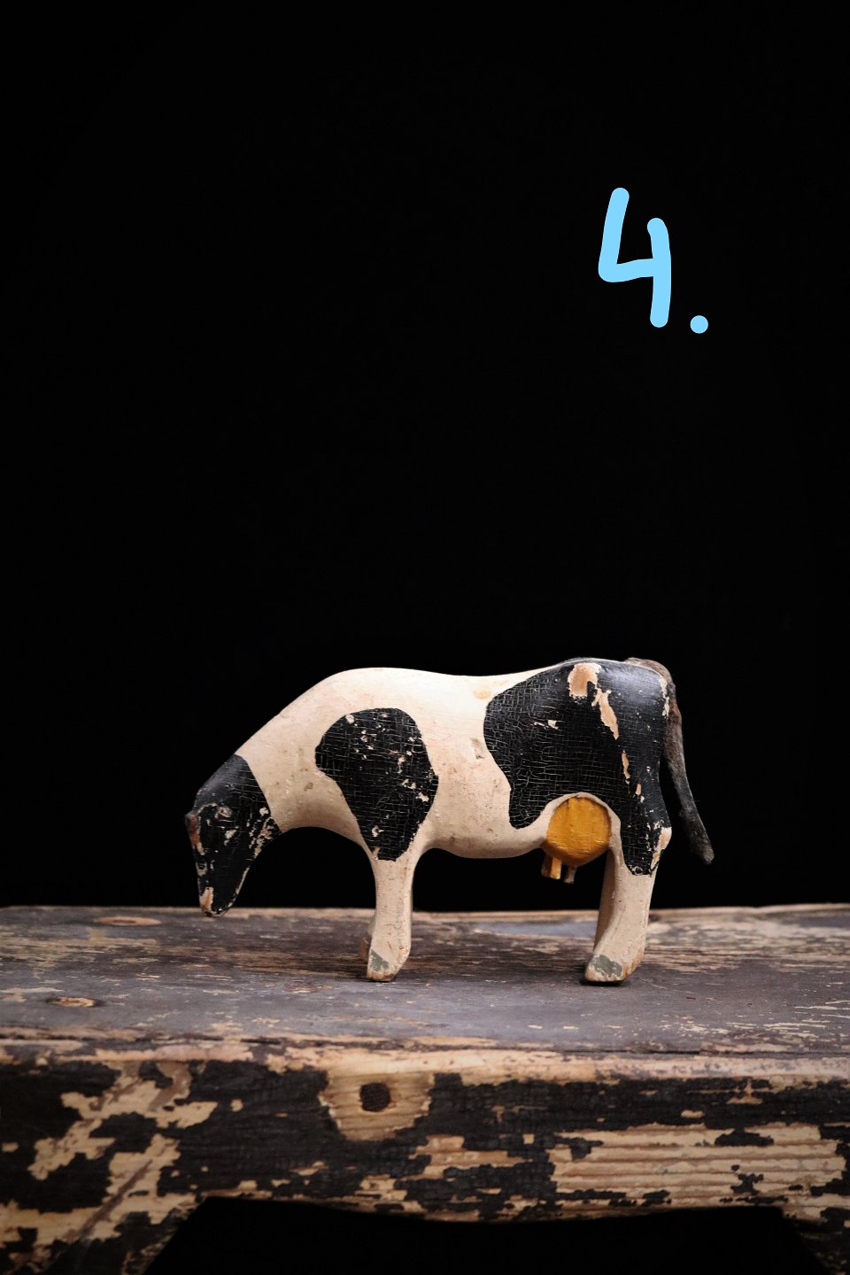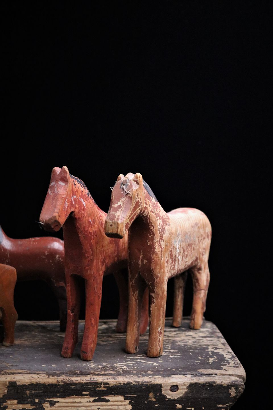 Gamle udskåret heste og køer i træ med gammel bemaling og patina...