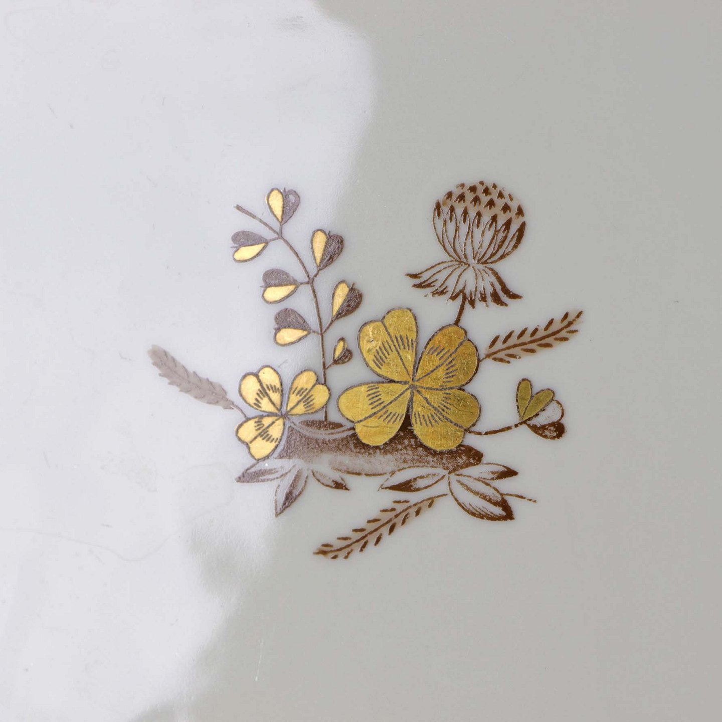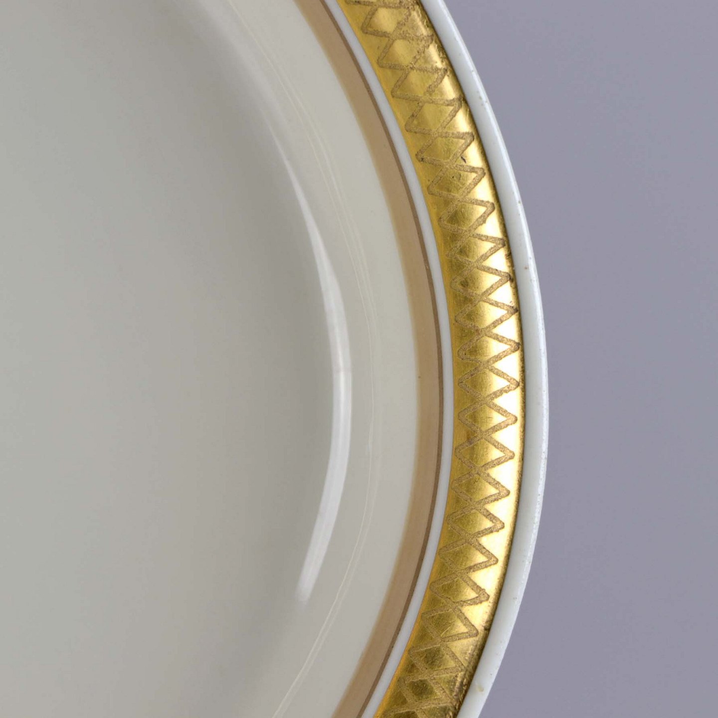Cremefarvet porcelæn med motiv af gylden kløverblomst og bred graveret guldkantkant.