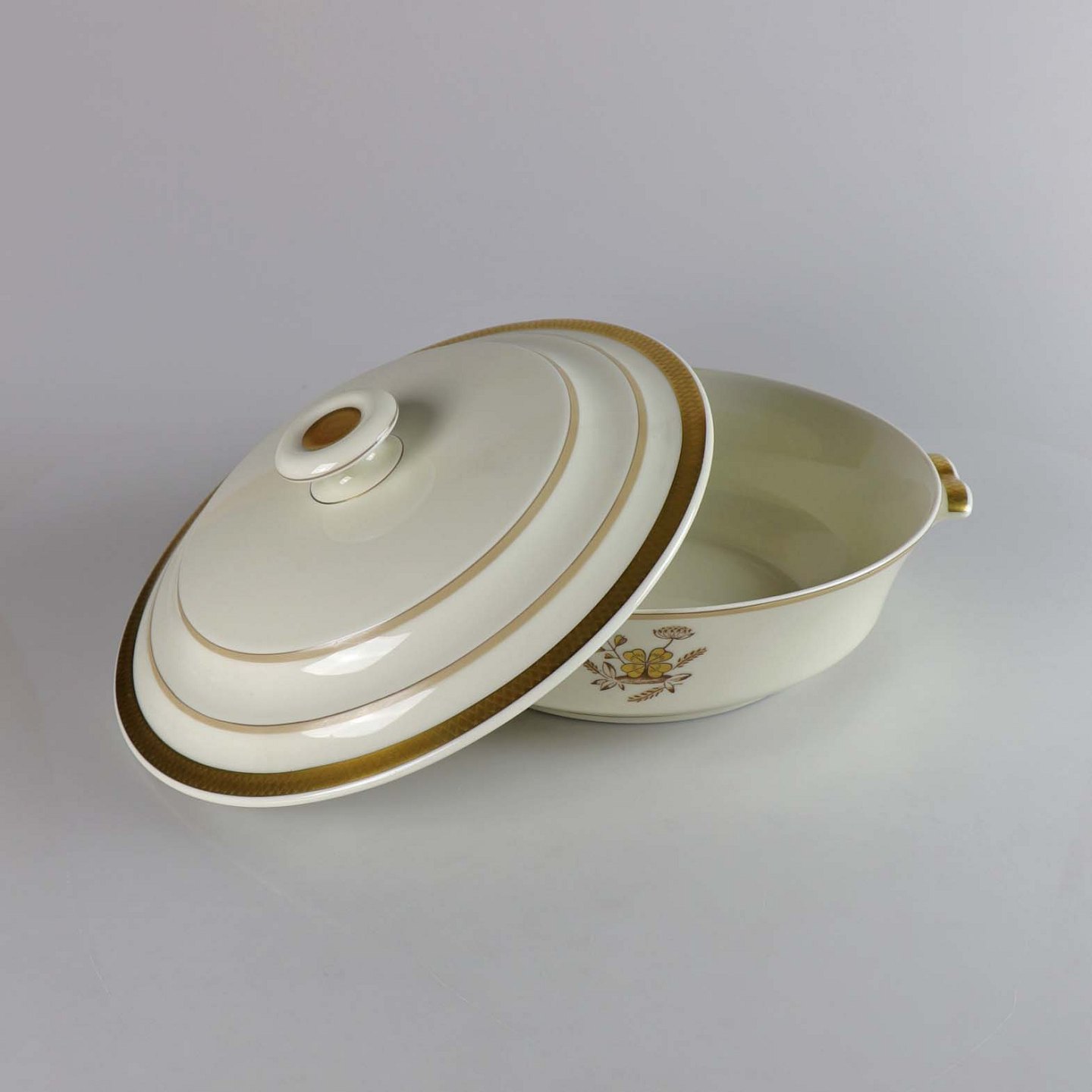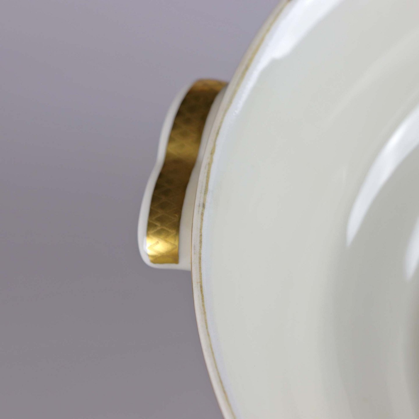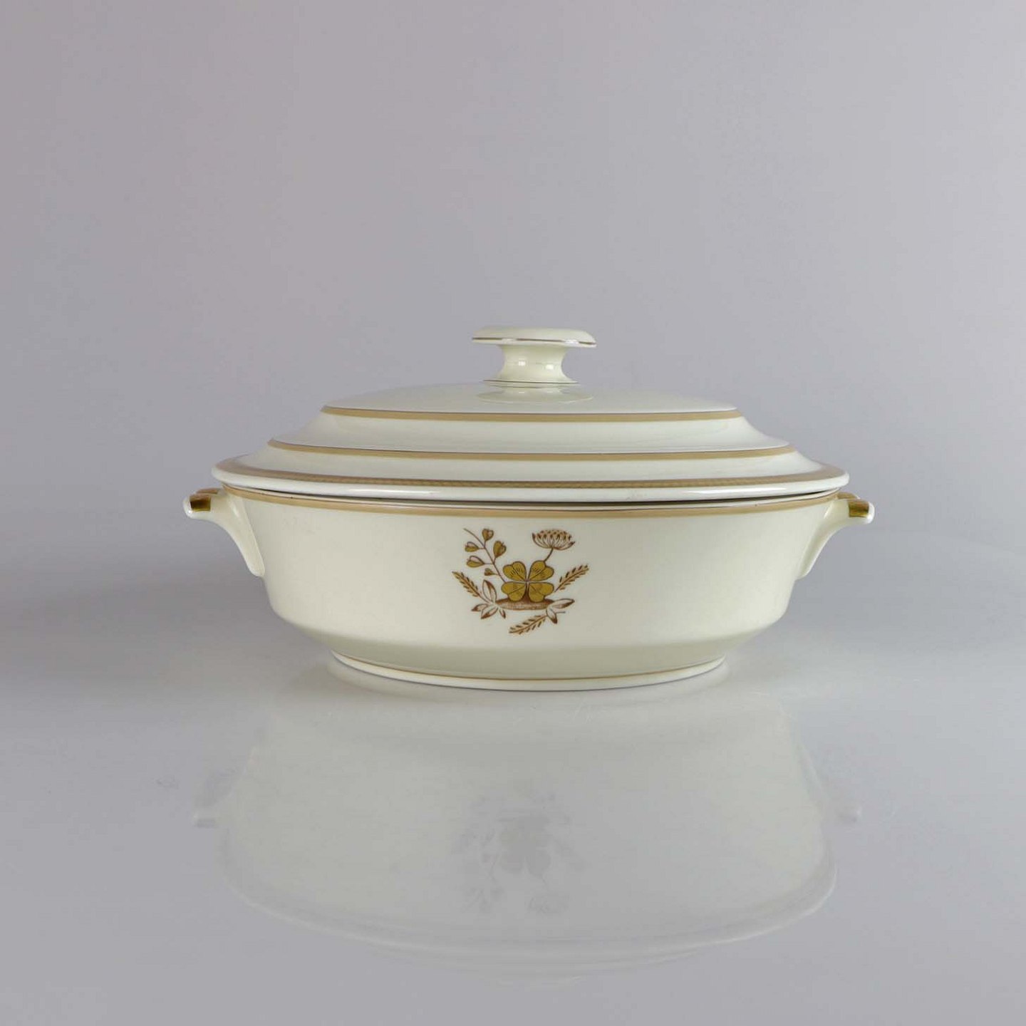 Cremefarvet porcelæn med motiv af gylden kløverblomst og bred graveret guldkantkant.