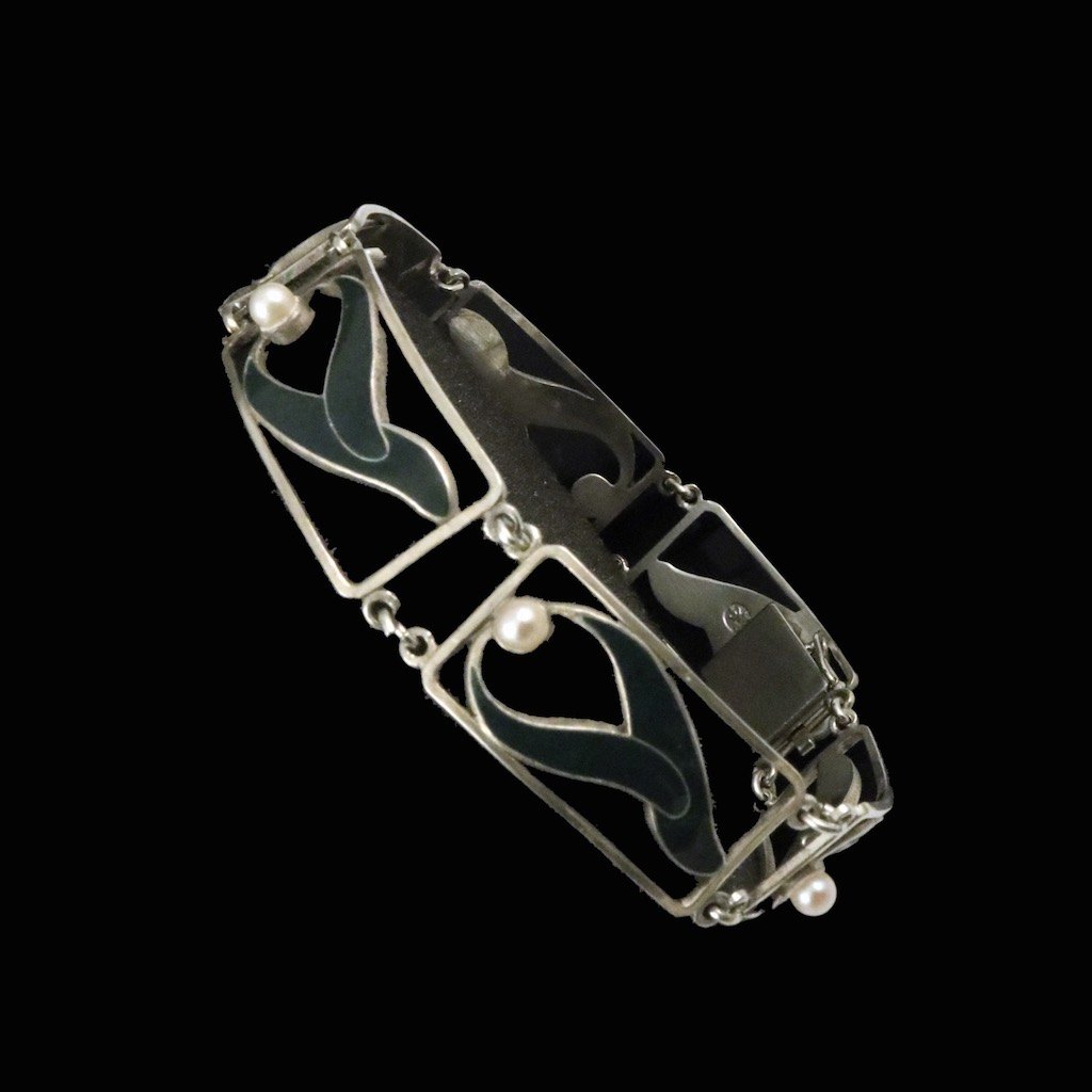 A. Michelsen. Armbånd i sølv med grøn emalje og perler.