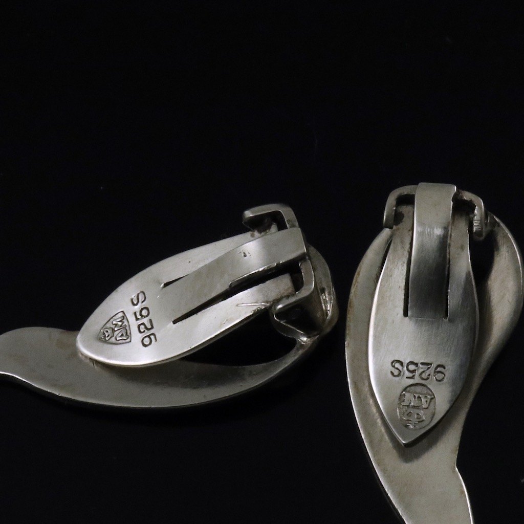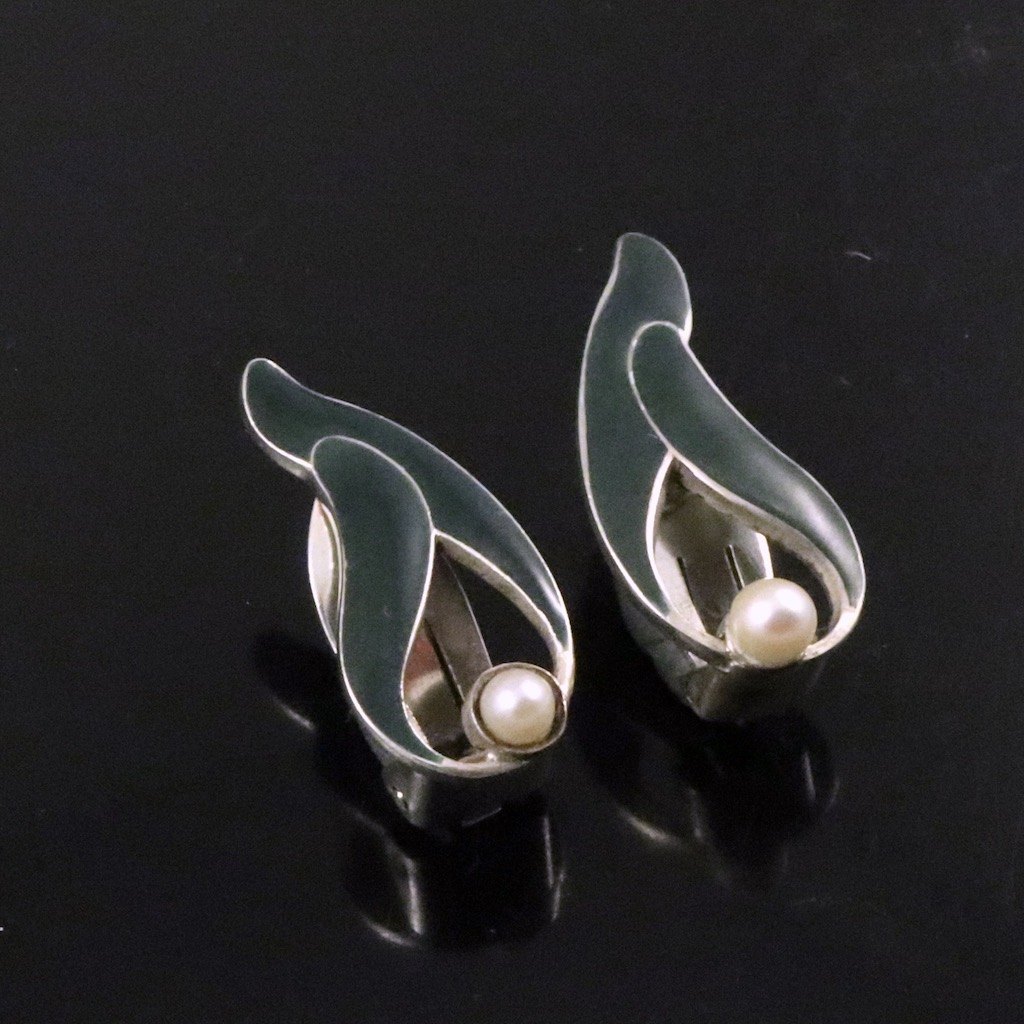 A. Michelsen. Øreklips i sterlingsølv med grøn emalje og perler.