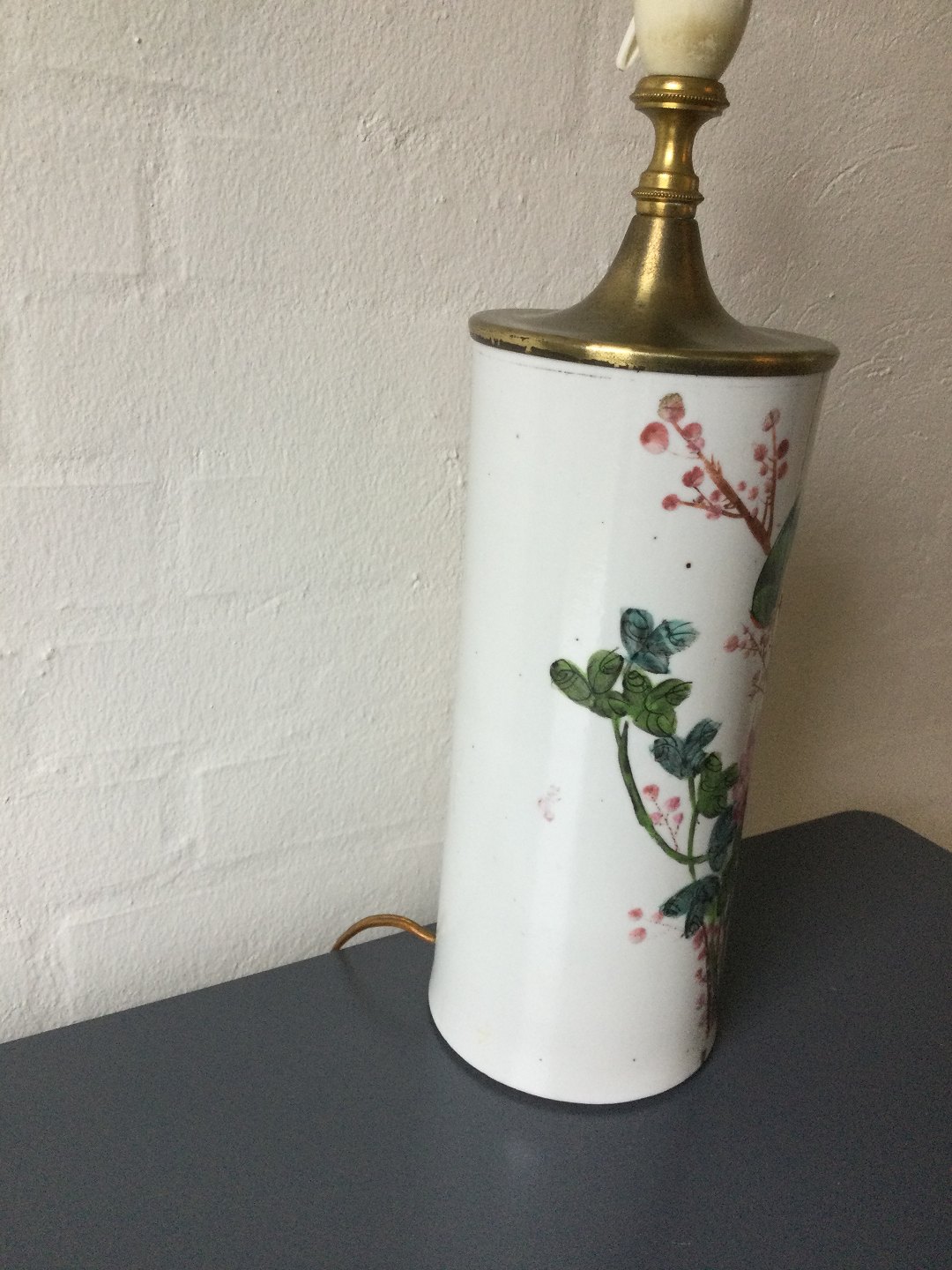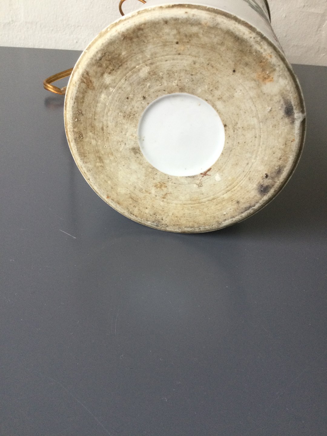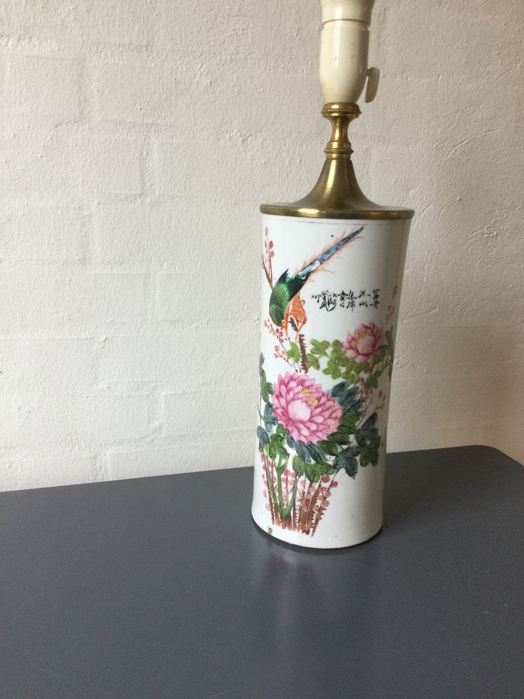 Polykromt dekoreret med fugle, blomster og skrifts tegn.