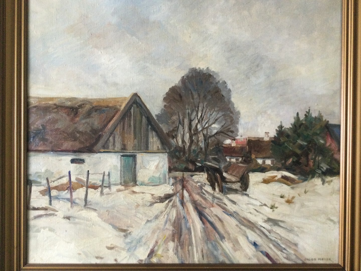 Maleri af Jacob Meyer - Vinterlandskab med vej forbi landejendom.