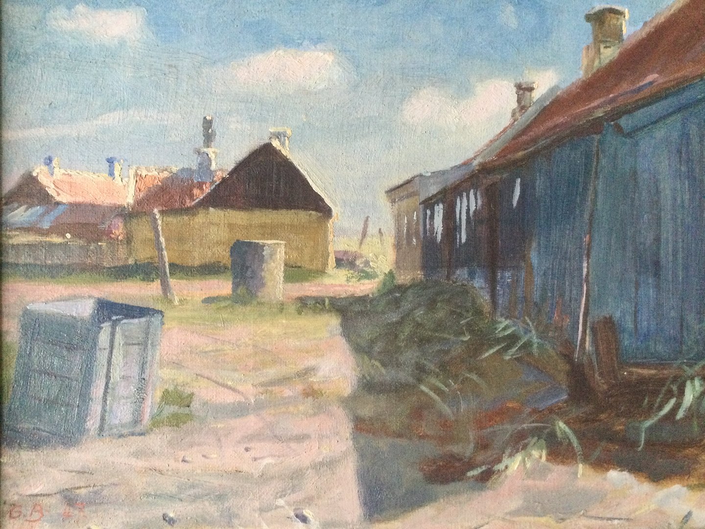Maleri af Gunner Bundgaard - Fiskerhuse i Skagen Vesterby 1947.