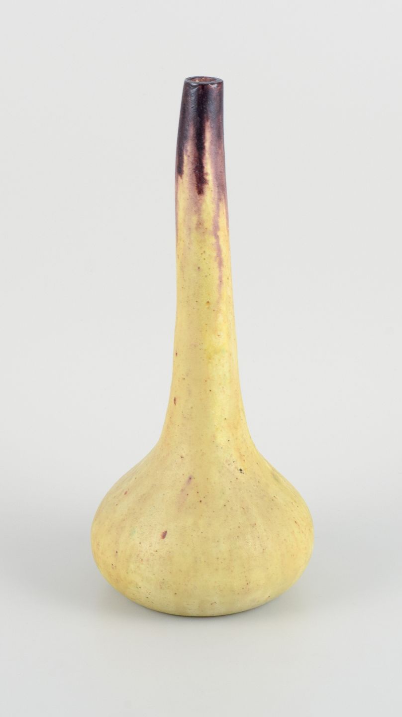 Europæisk studiokeramiker, høj smalhalset unika keramikvase i gul og brun dekoration. Antageligt belgisk keramiker.