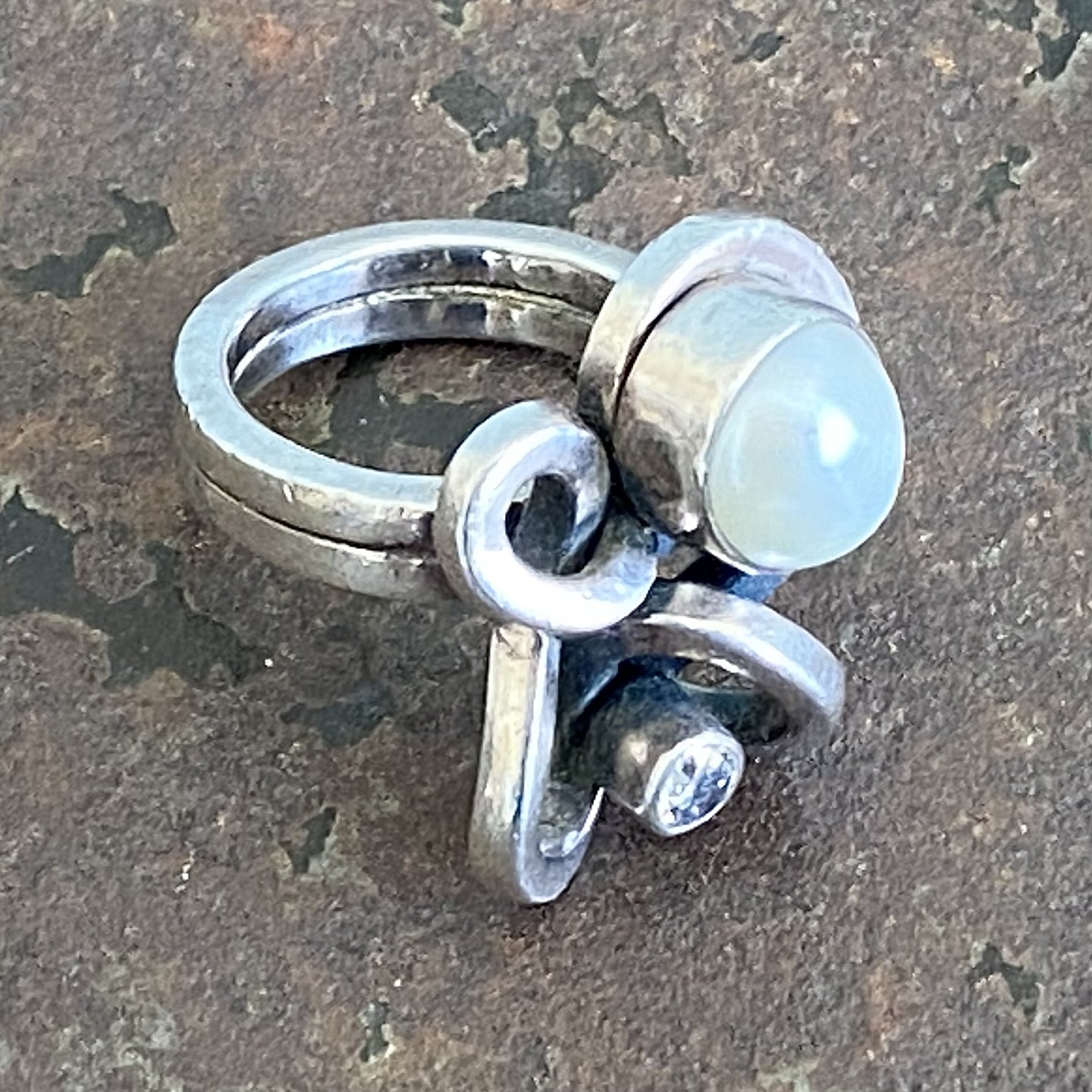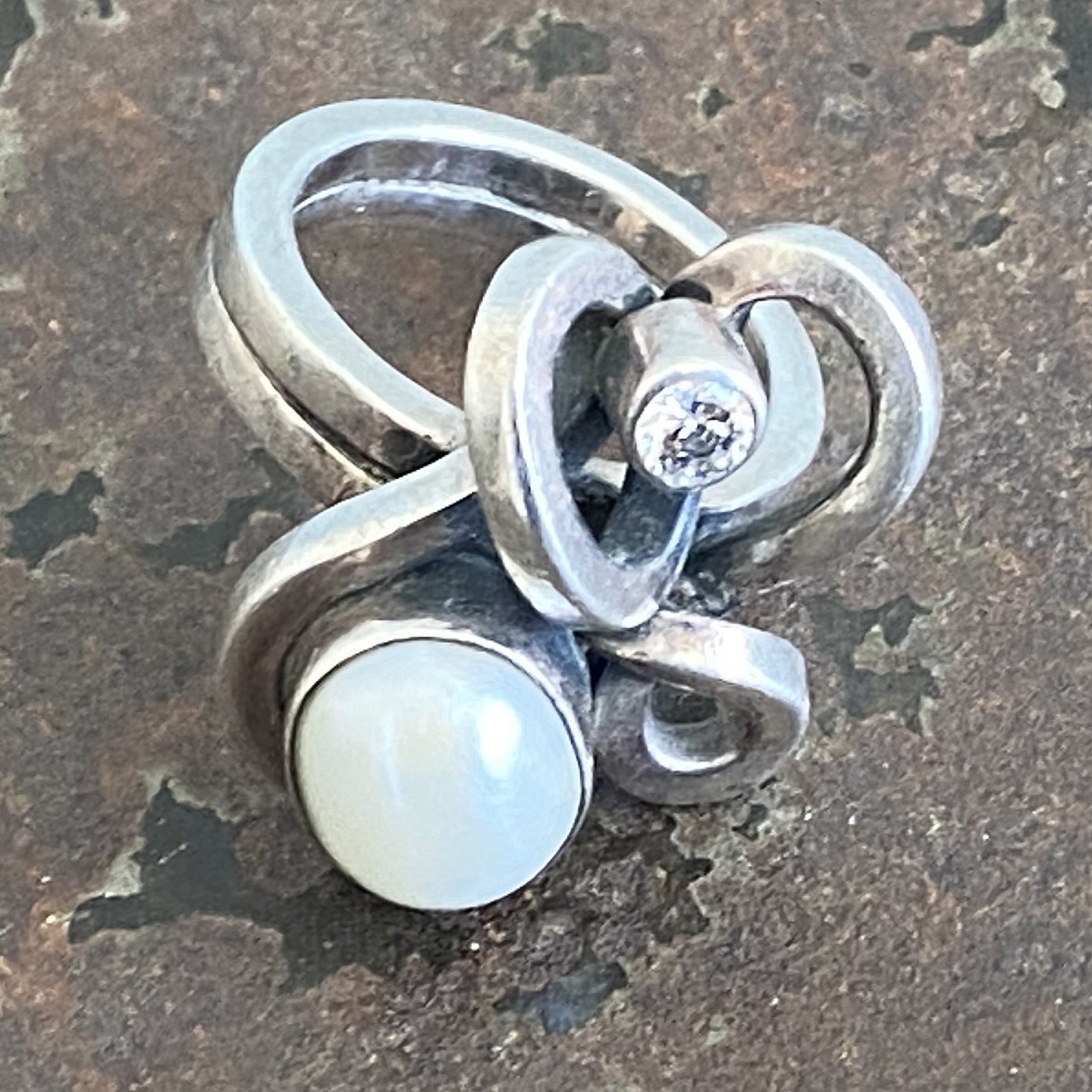 Smuk skulpturel ring af sterling sølv med perle og zirkonia sten.