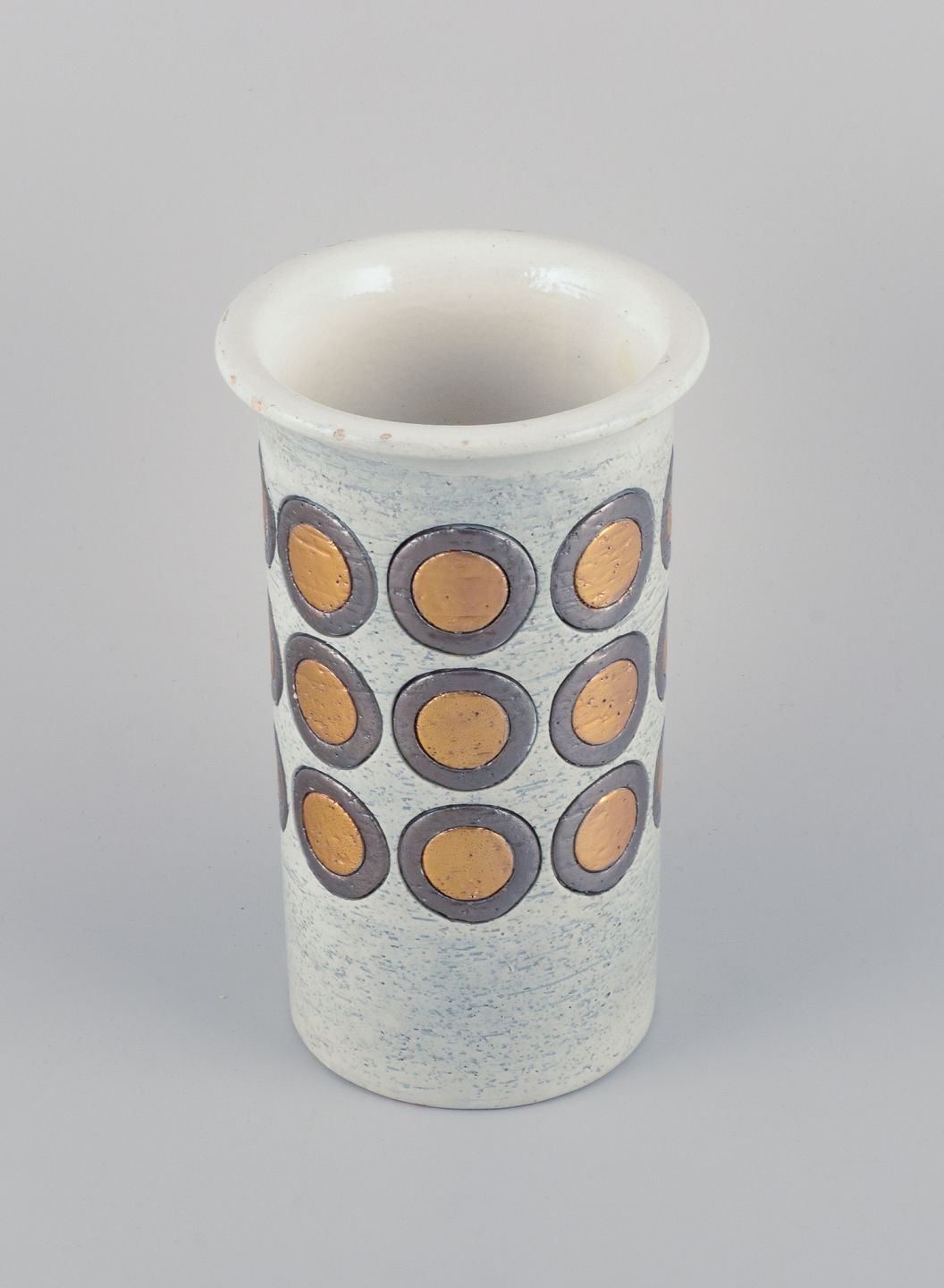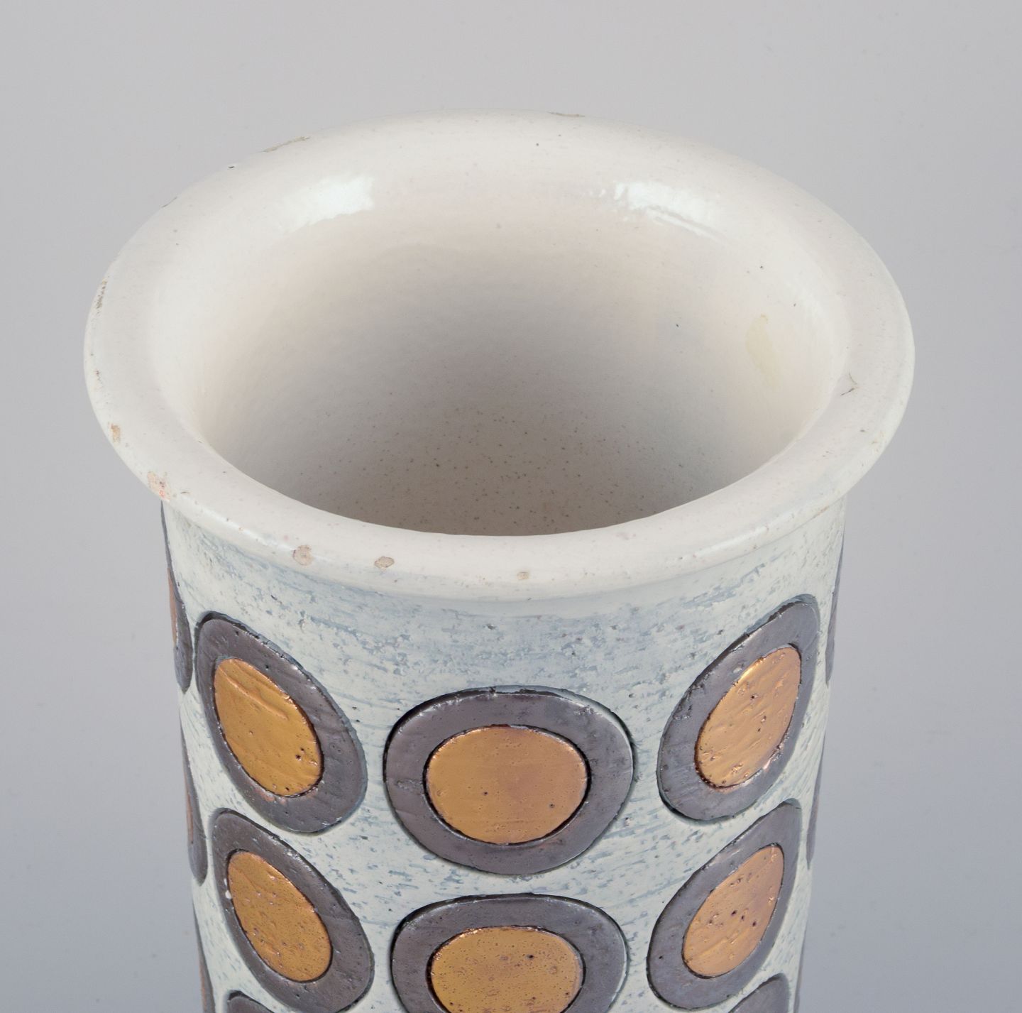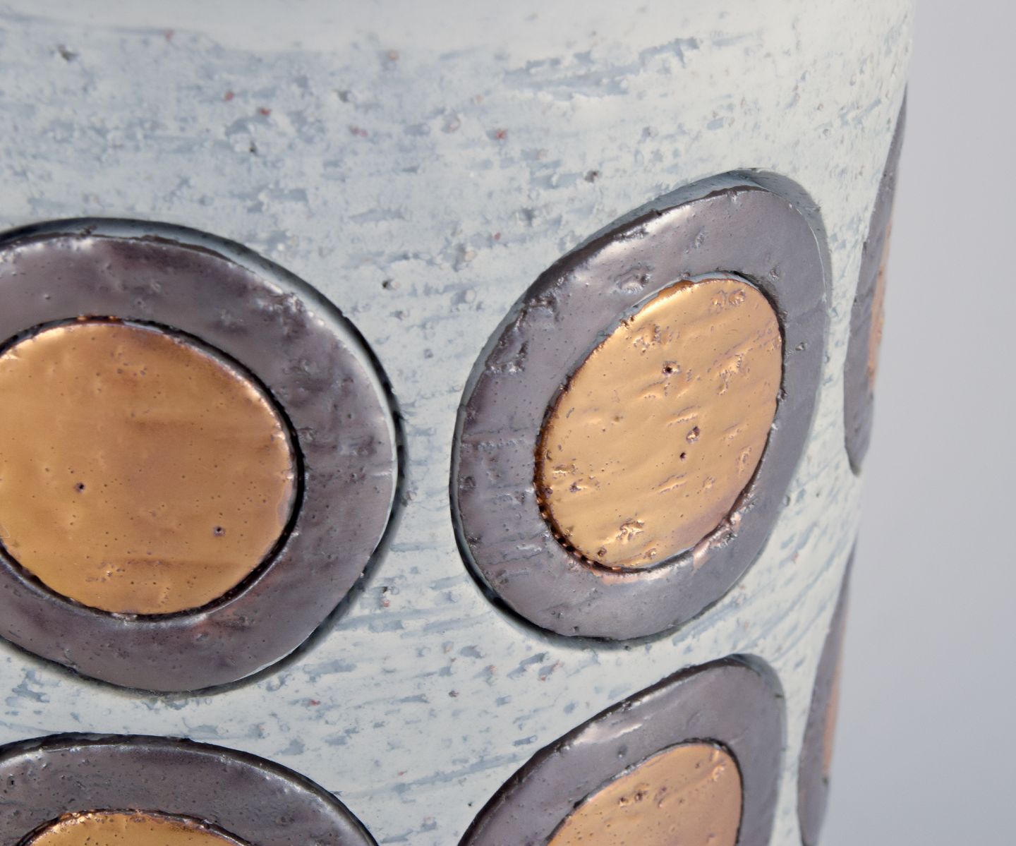Aldo Londi for Betossi, Italien, stor ”Ikano” keramikvase i retrostil. Grå glasur. Designet med cirkler dekoreret i sølv og guld.