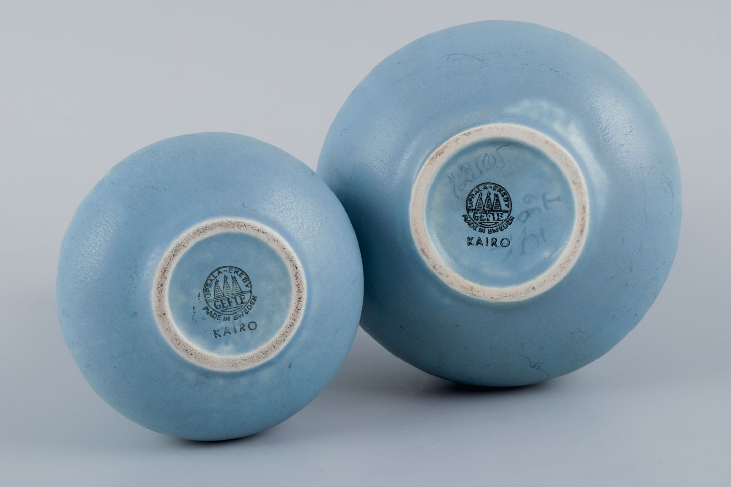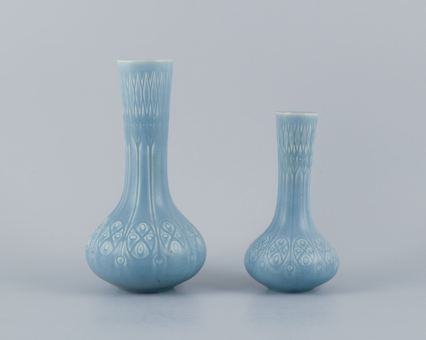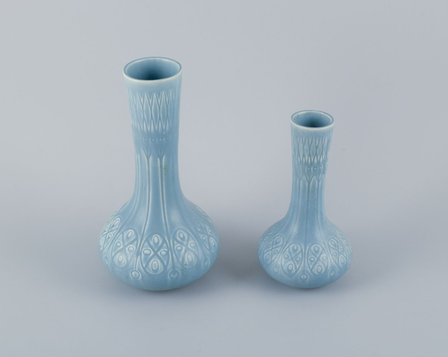 Upsala-Ekeby/Gefle, Sverige. To ”Kairo” keramikvaser i lyseblå glasur.