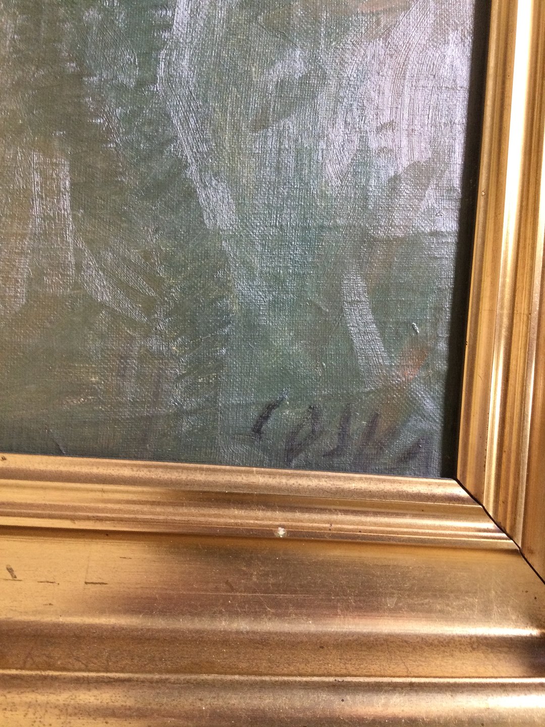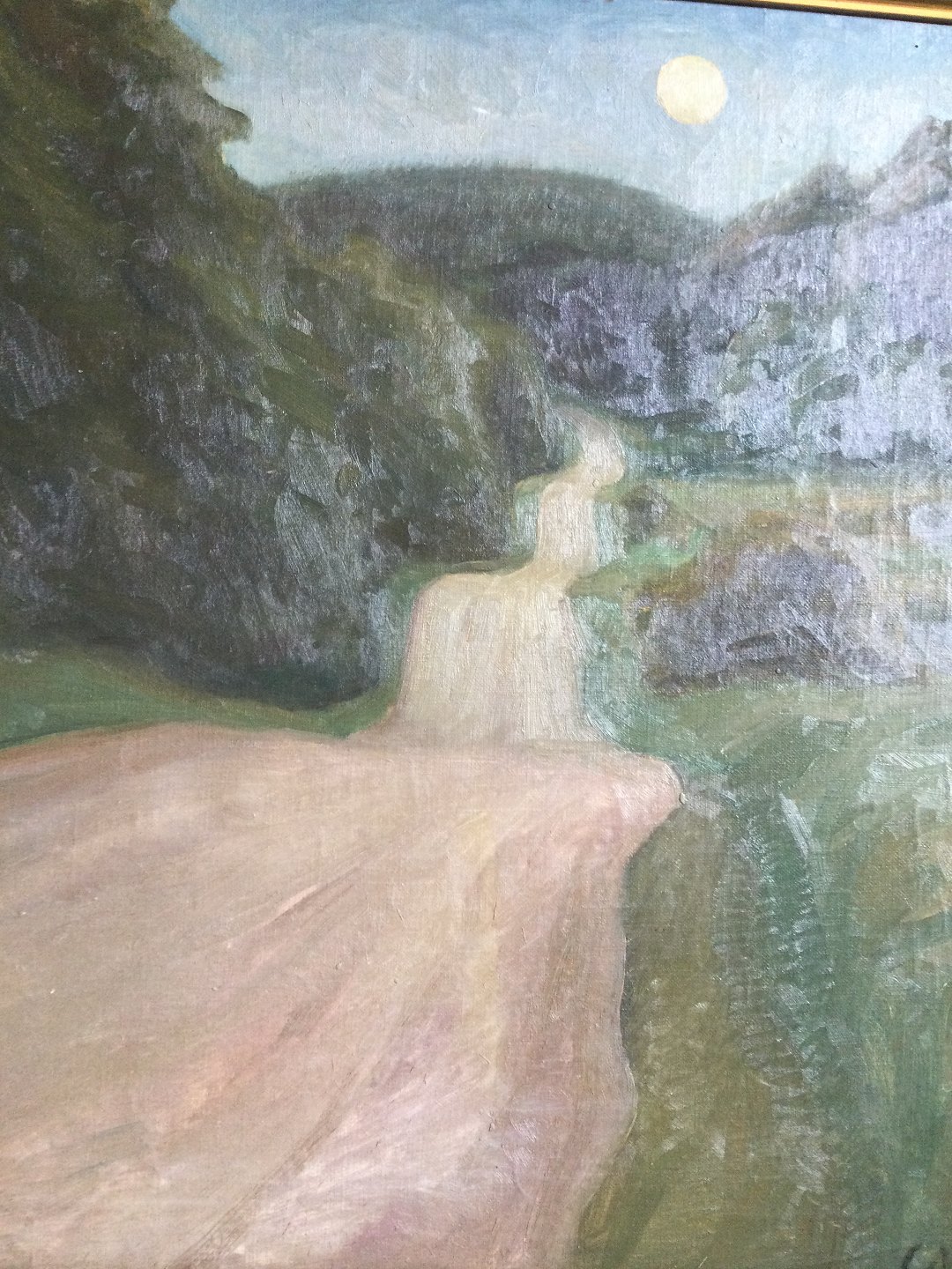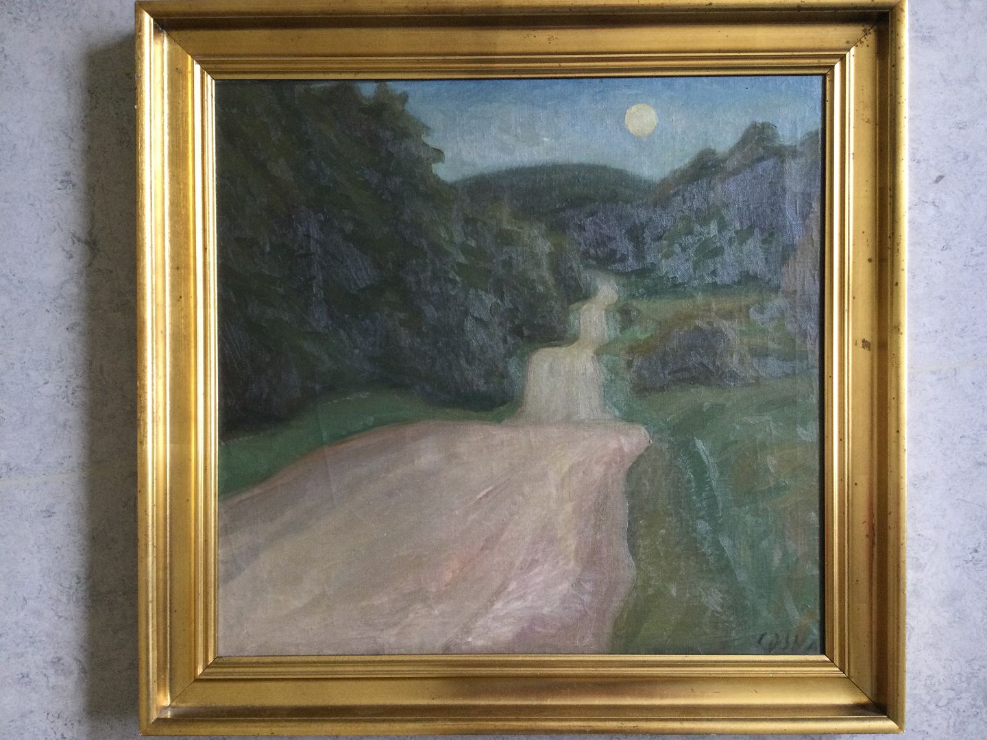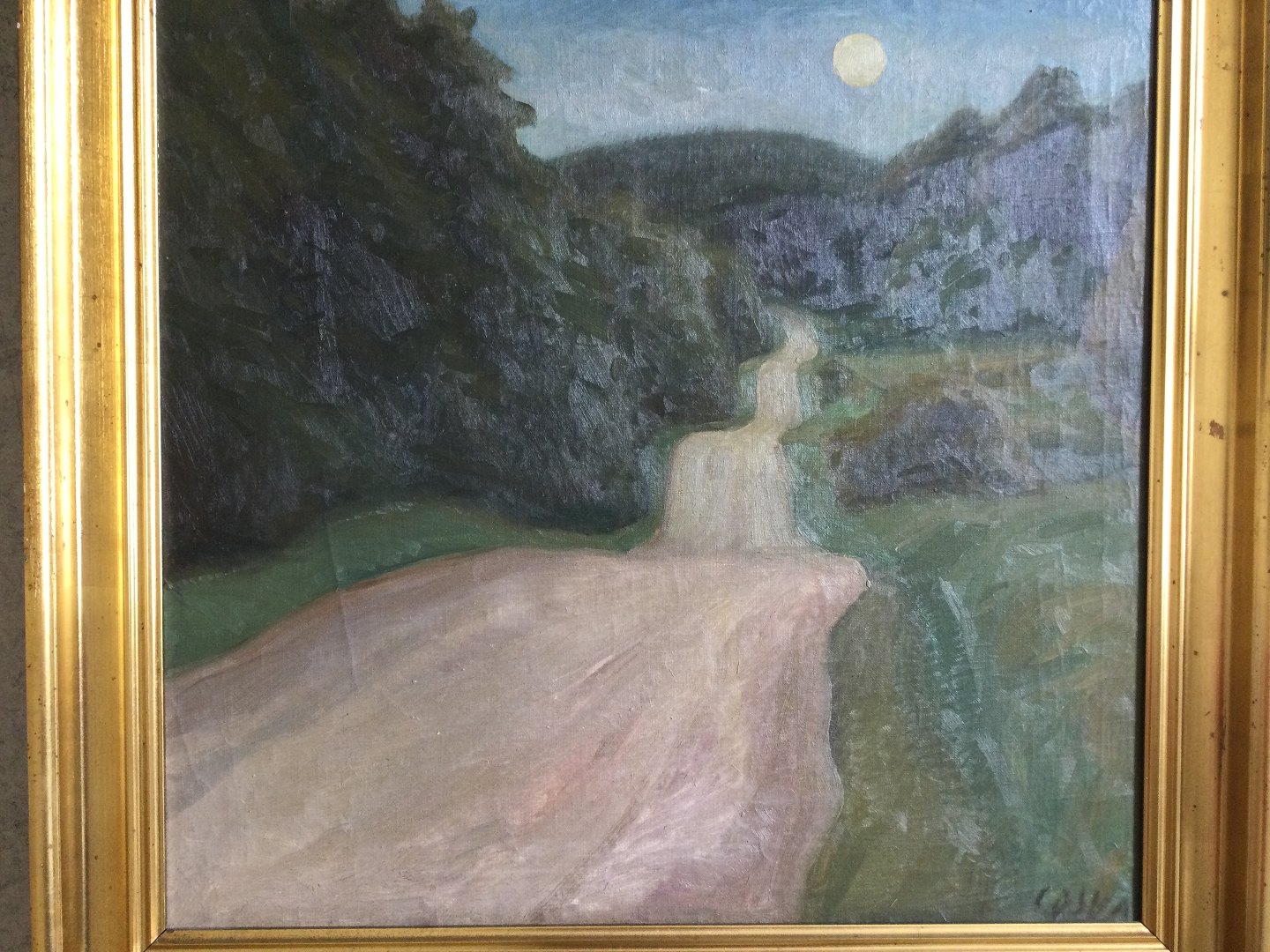 Maleri af Søren Josva Christensen - Vej gennem bakket landskab i måneskin.