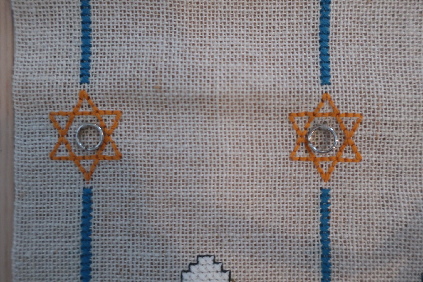 Smuk, gammel, håndbroderet pakkekalender med ringe til at binde pakkerne fast i