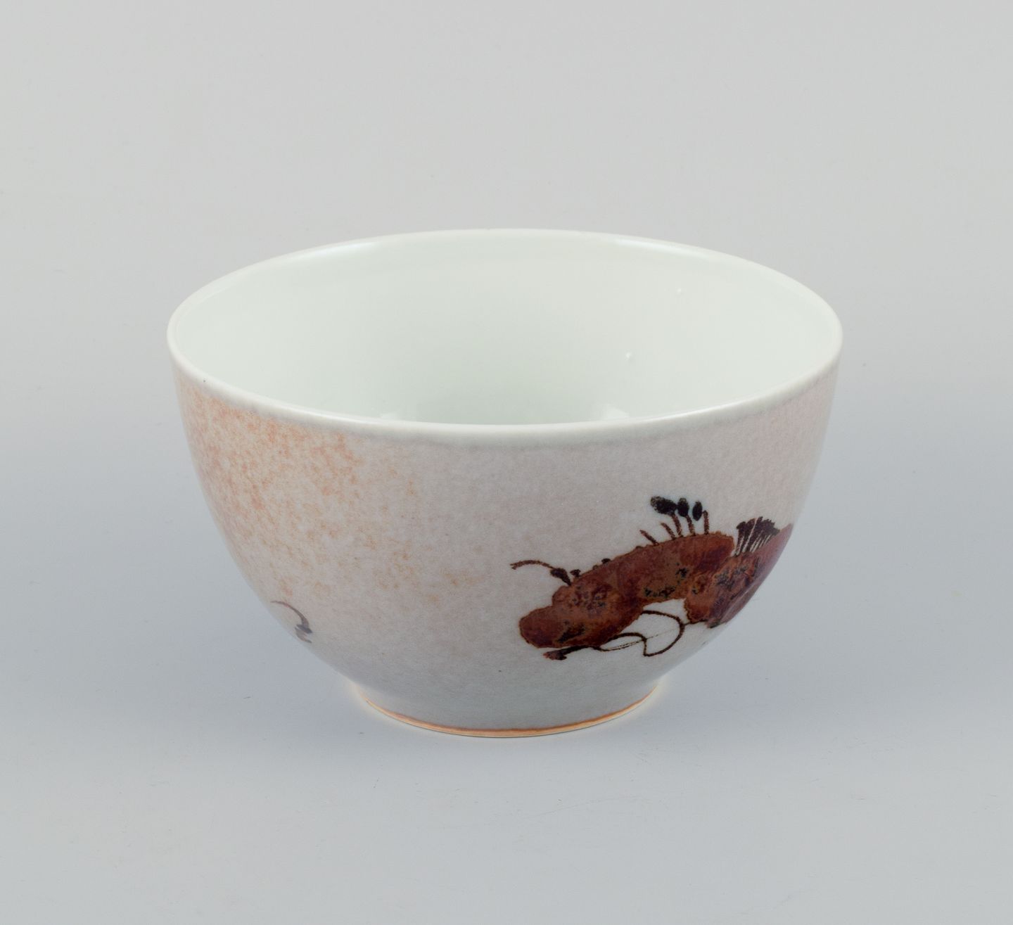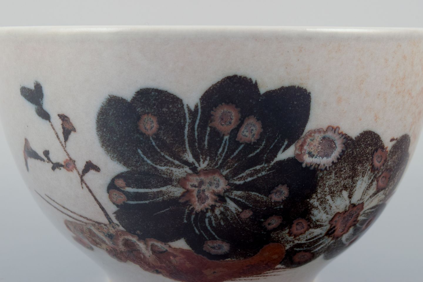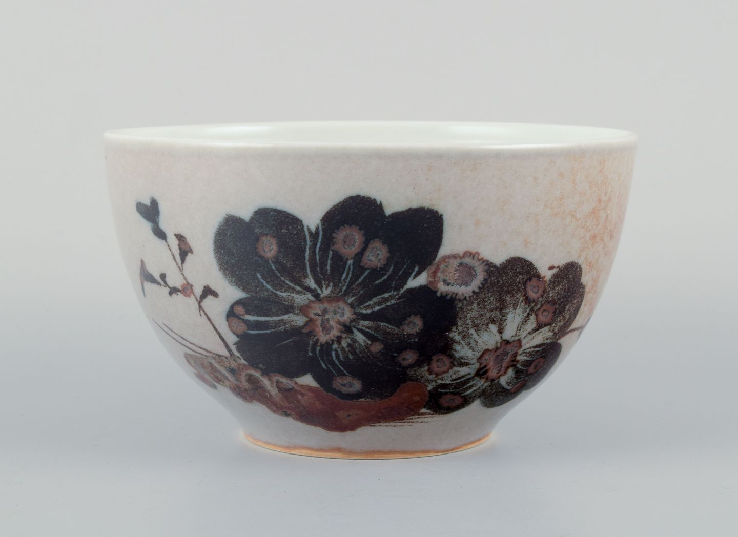 Nils Thorsson for Royal Copenhagen, unika keramikskål dekoreret med blomster. Glasur i brune nuancer på beige baggrund.
