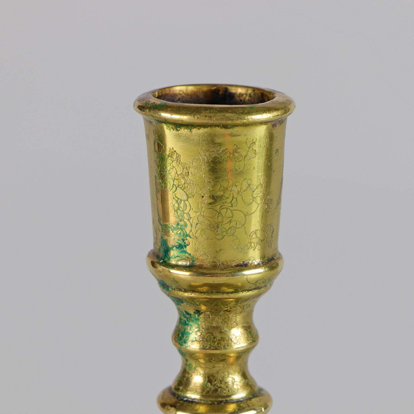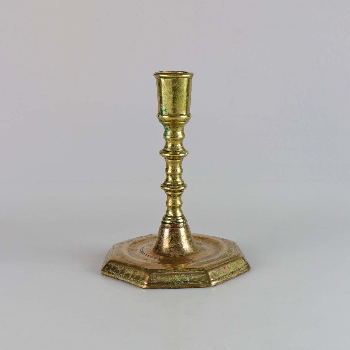 Antik messing lysestage med otte-kantet fod og graveret mønster