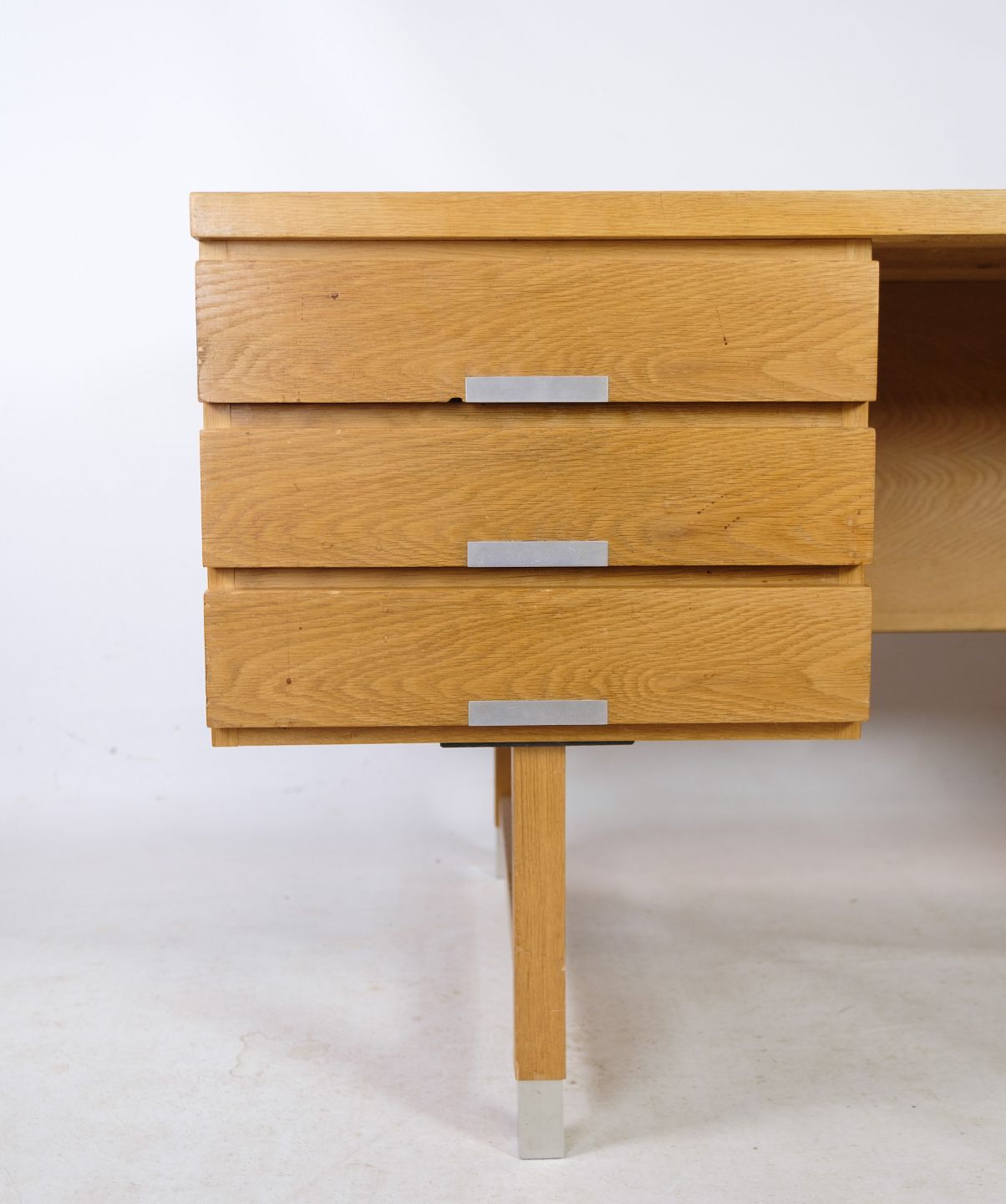 Med sit smukke egetræsfinish udstråler skrivebordet en naturlig og varm æstetik, der passer perfekt til enhver indretningsstil. Egetræet er kendt for sin holdbarhed og tidløse skønhed, hvilket gør dette skrivebord til et elegant og funktionelt møbelstykke, der vil holde i årtier.