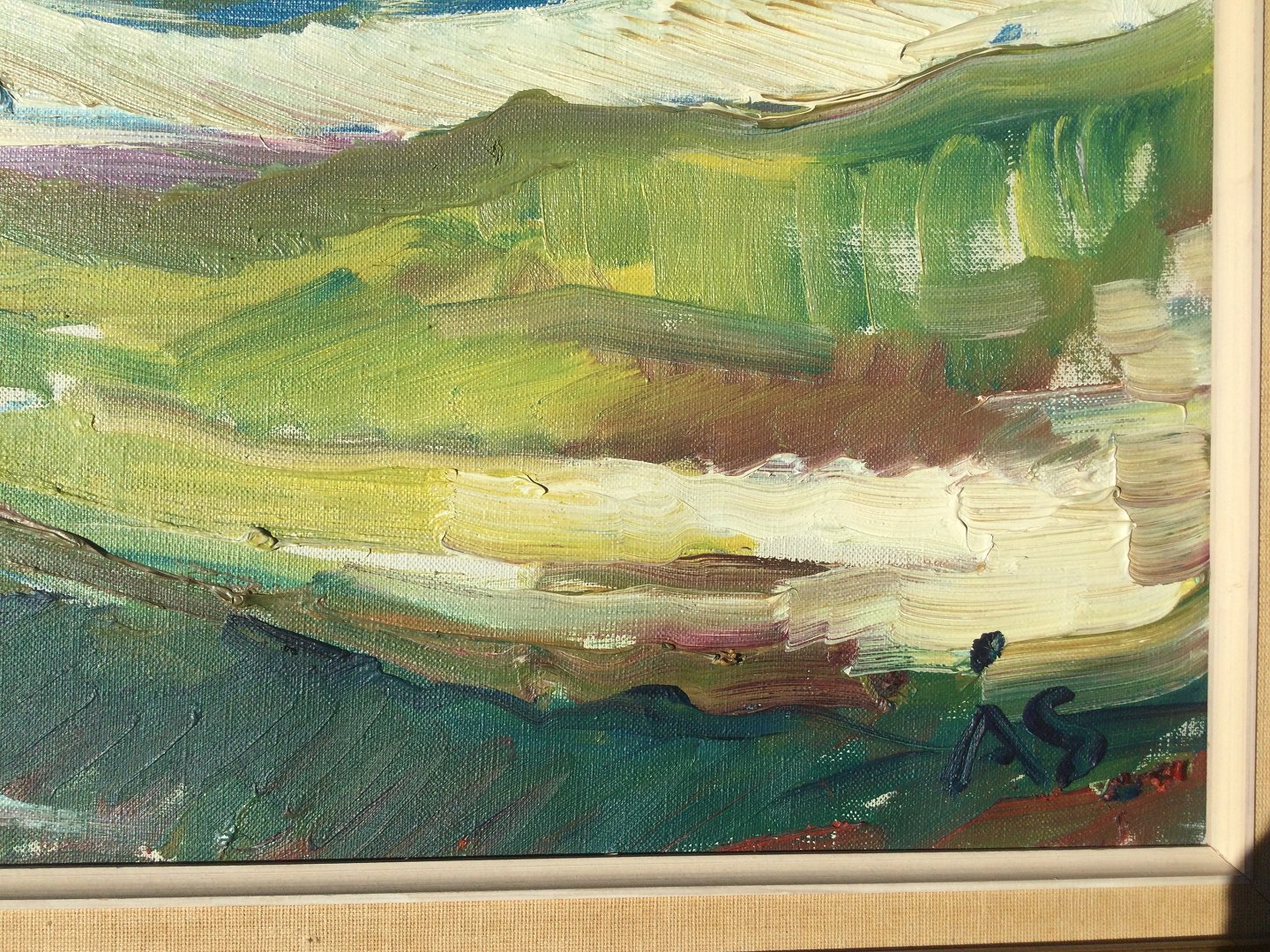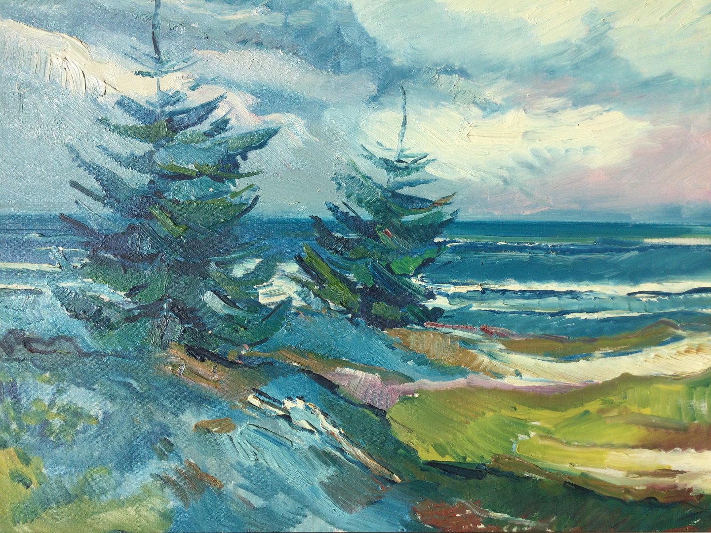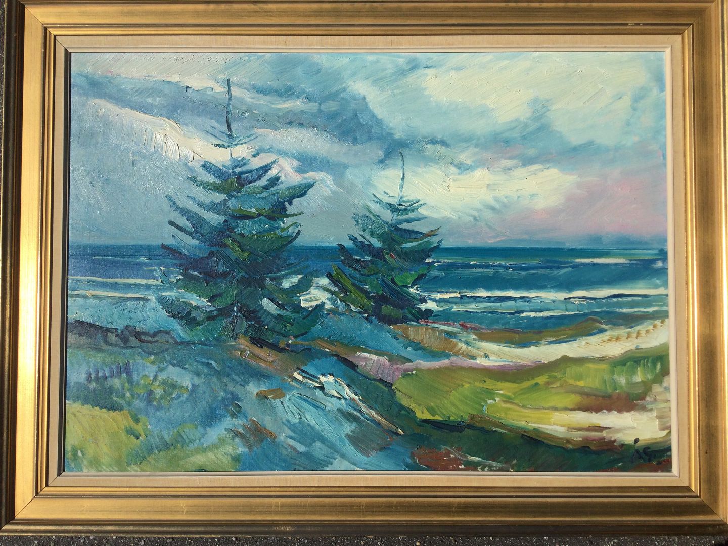 Text available in Danish: Maleri af Aage Strand - Klitter og graner ved Havet.