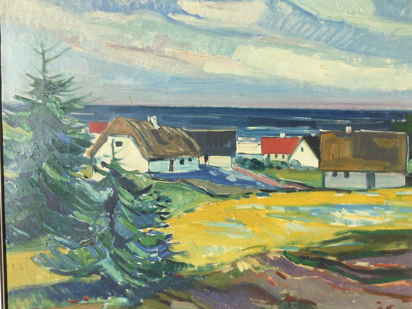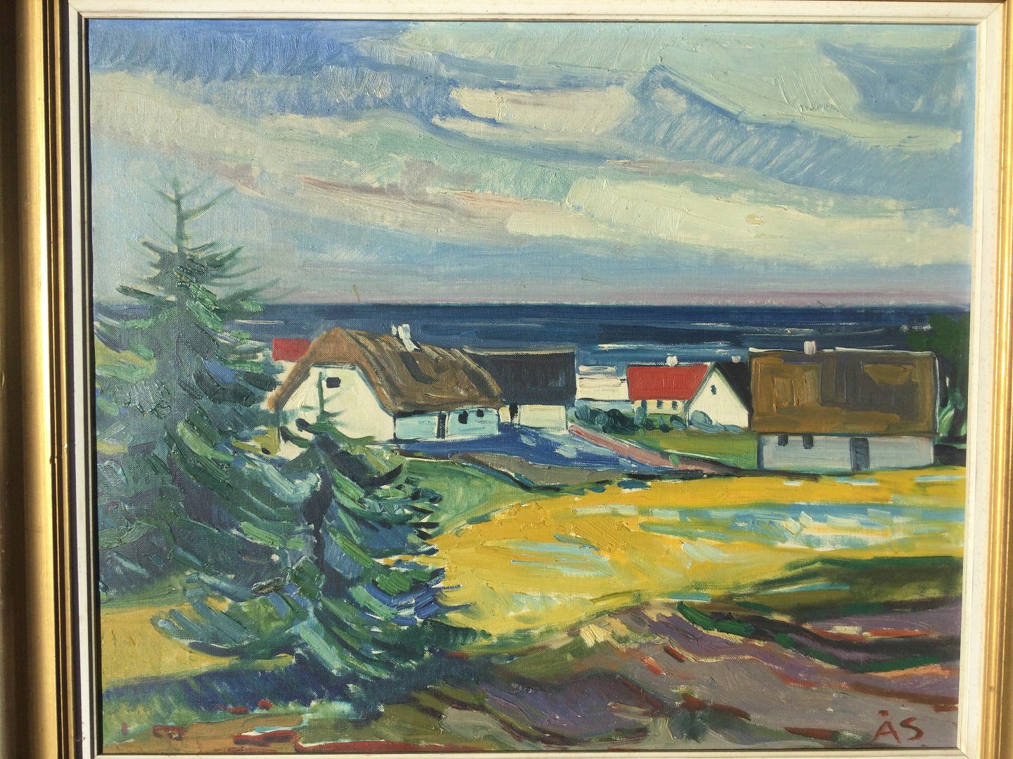 Maleri af Aage Strand - Kystparti med gårde.
