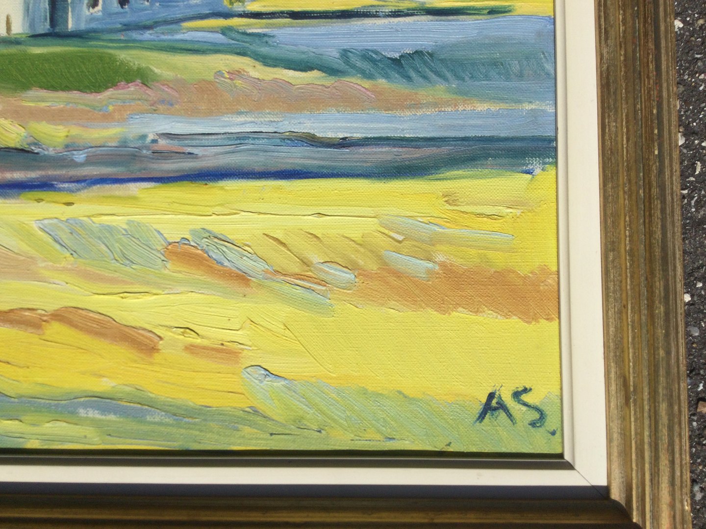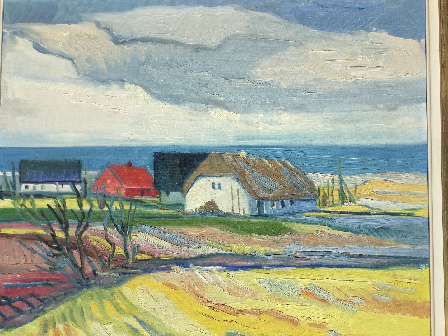 Maleri af Aage Strand - Kystparti med gårde.
