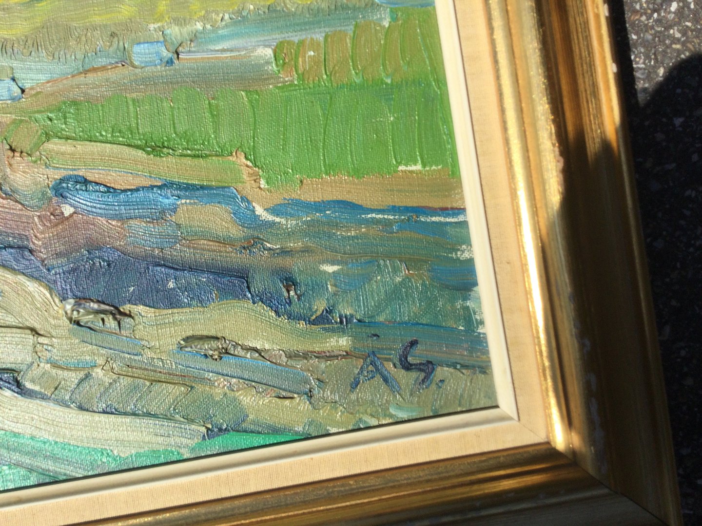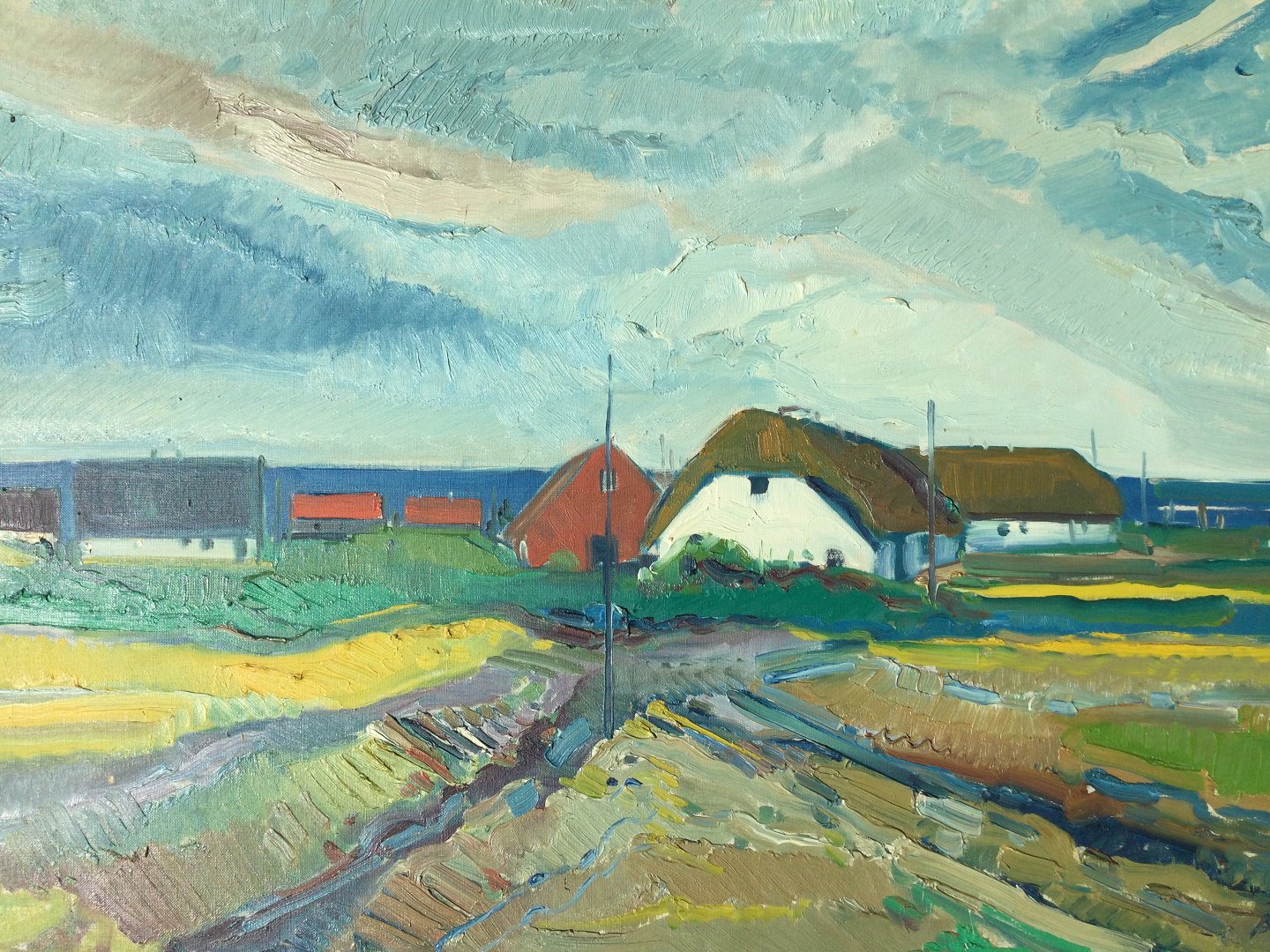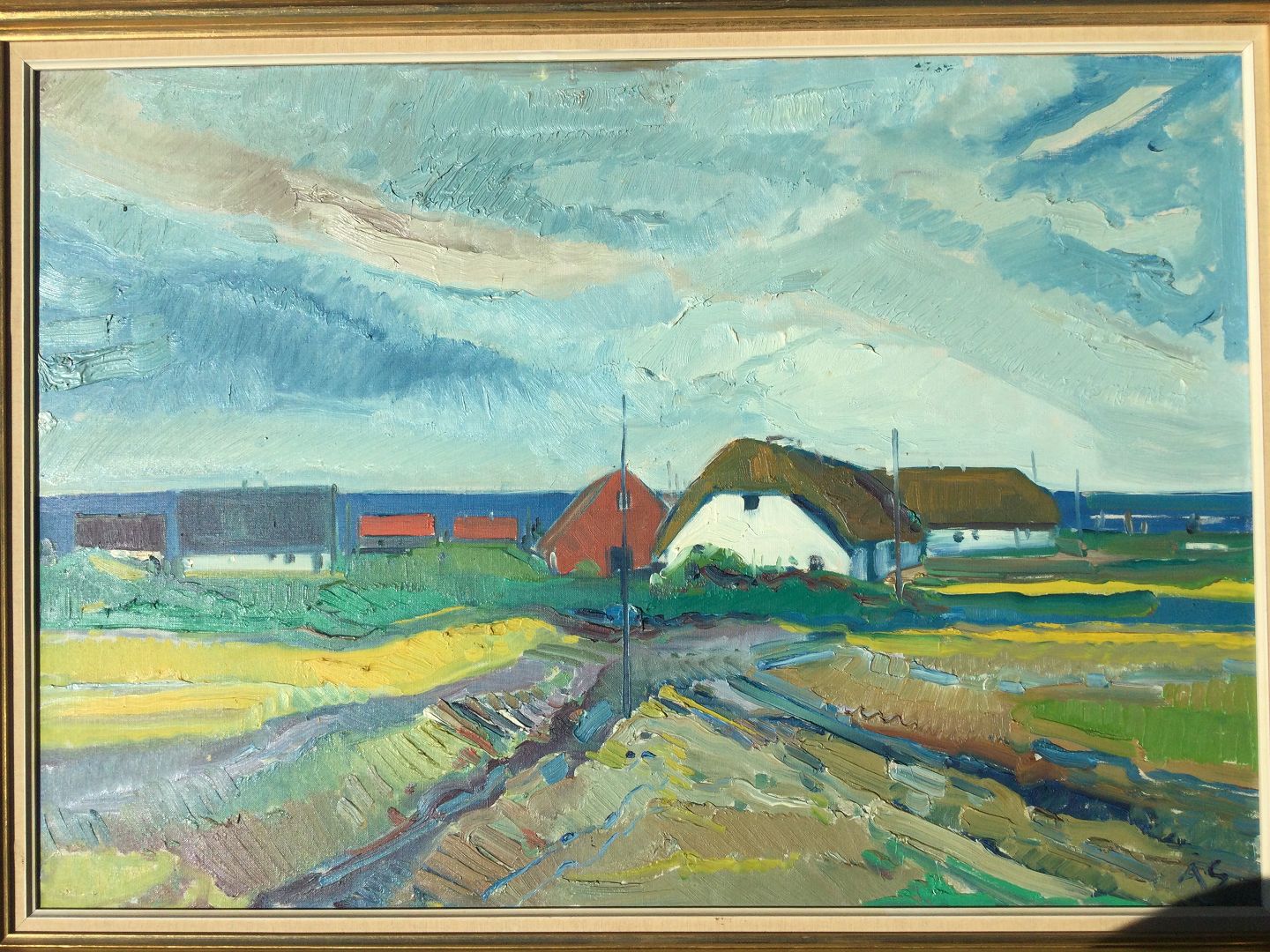 Maleri af Aage Strand - Kystparti med gårde.