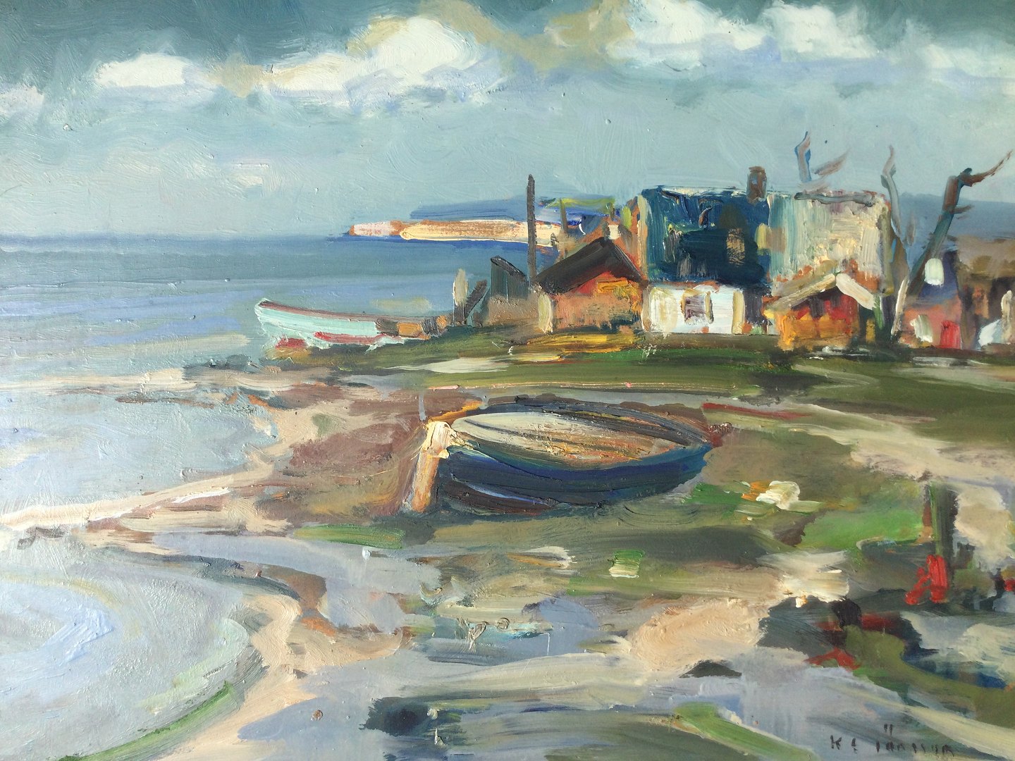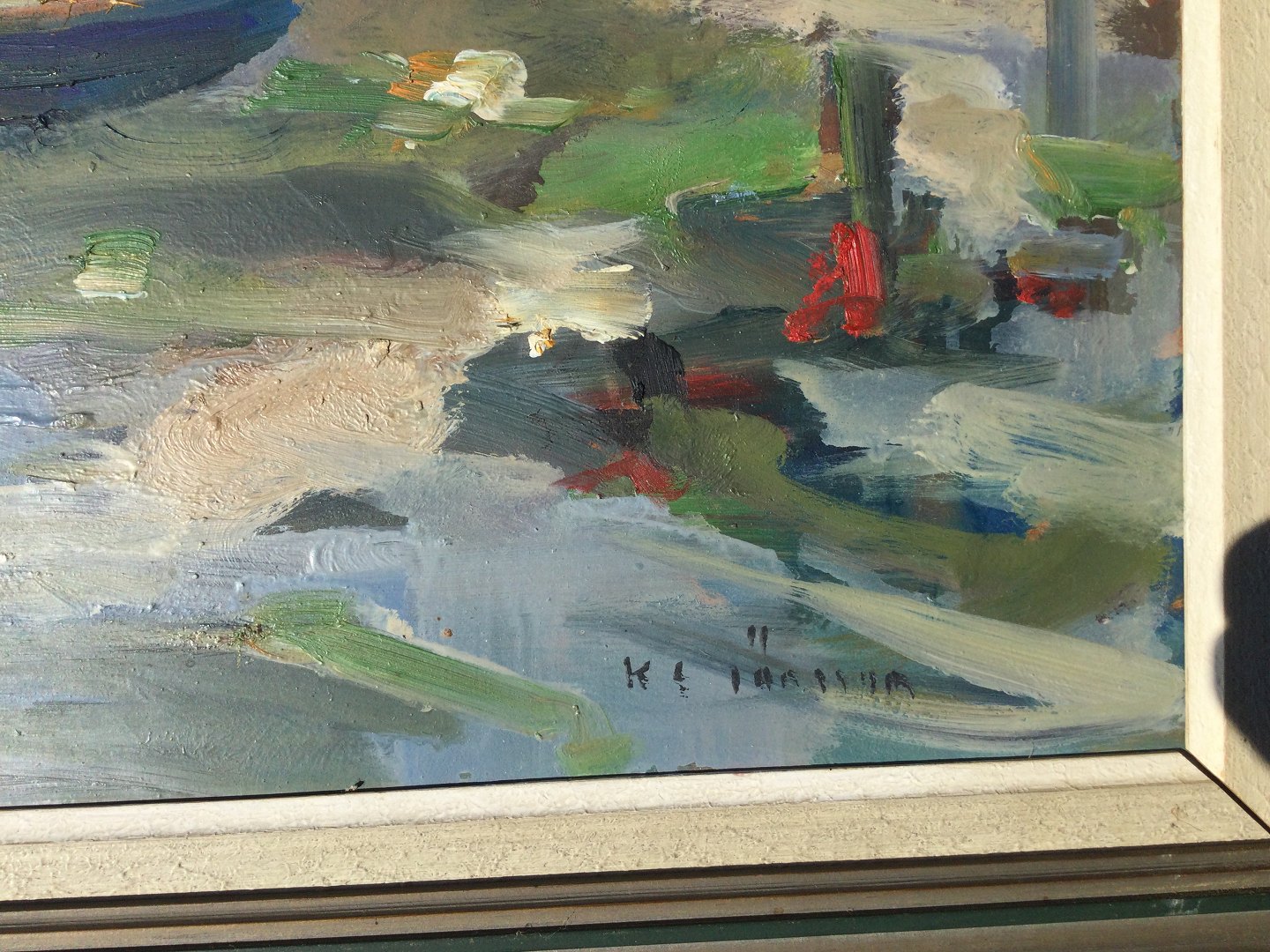 Maleri af Karl Einar Jönsson - havneparti i Sverige.