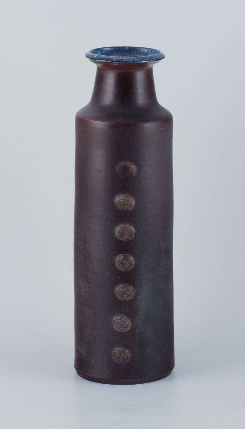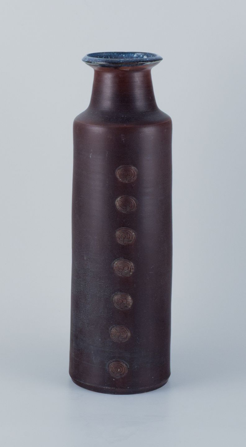 Large ceramic floor vase in a modernist style with incised ornamentation. Glazed in shades of blue and brown.
