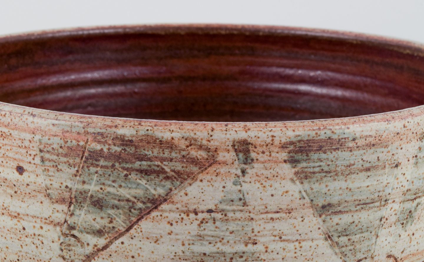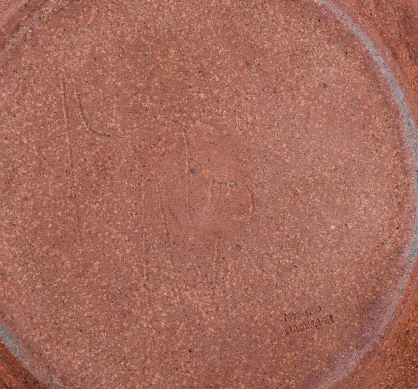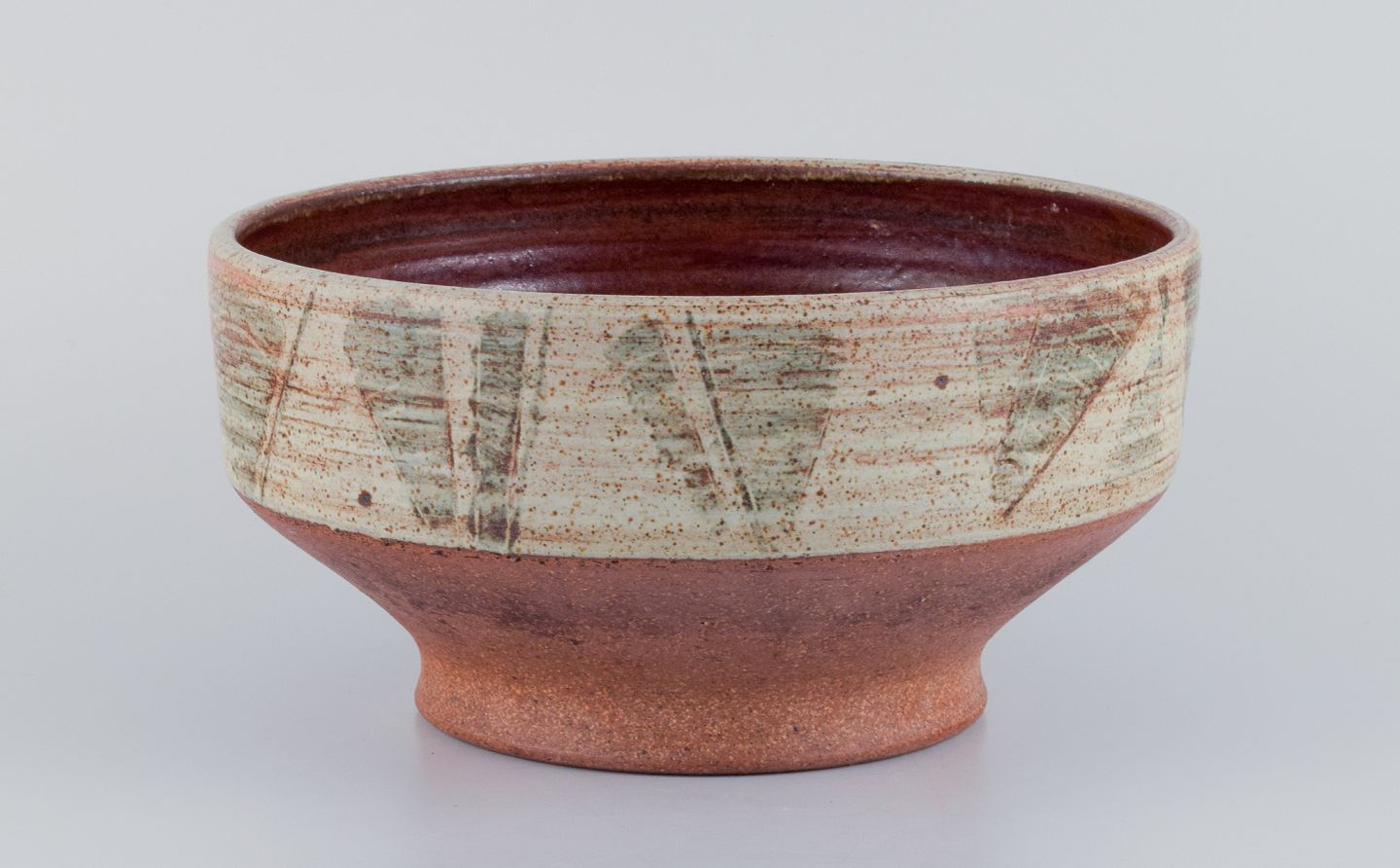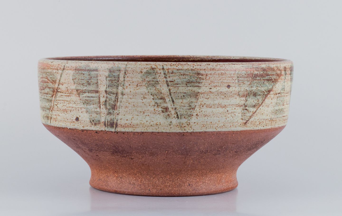Mogens Nielsen, Nysted, stor håndlavet skål i keramik dekoreret med abstrakte motiver. Glasur i brune toner.