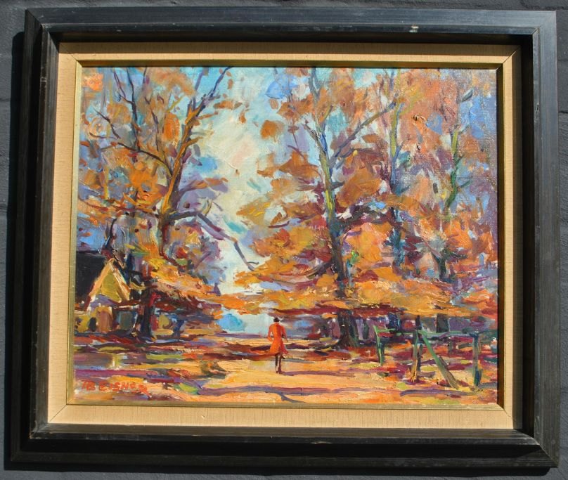 Eisner, Ib (1925 - 2003) Danmark: En gående i en park - efterår. Olie på lærred. Signeret. 41 x 51 cm.