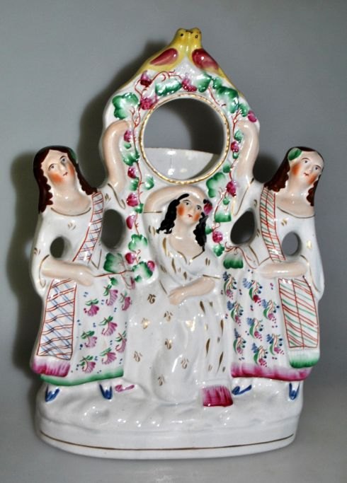 Staffordshire fajance urholder, ca. 1840, England. Dekoration i form af tre kvinder. Polykrom håndbemaling med forgyldning. H.: 28 cm. B.: 20 cm.