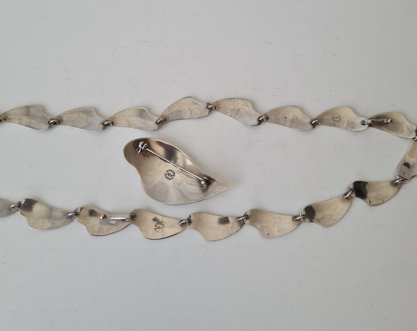 Smykke sæt bestående af halskæde, armbånd og broche udført i sterlingsølv prydet med stjerner i sort emalje. Halskæden og armbåndet kan sættes sammen til en lang halskæde.