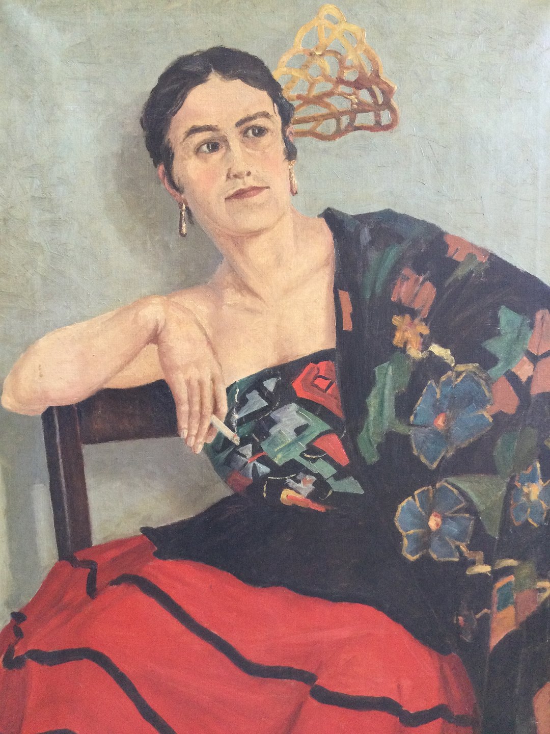 Portræt af siddende, spanske kvinde med rygende cigaret.