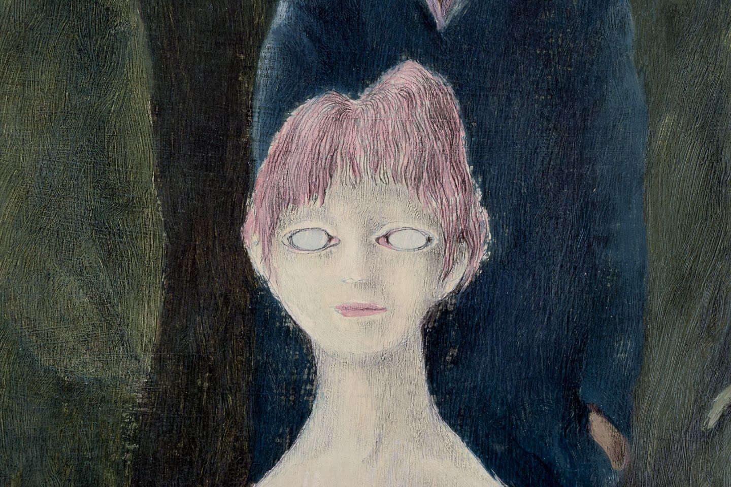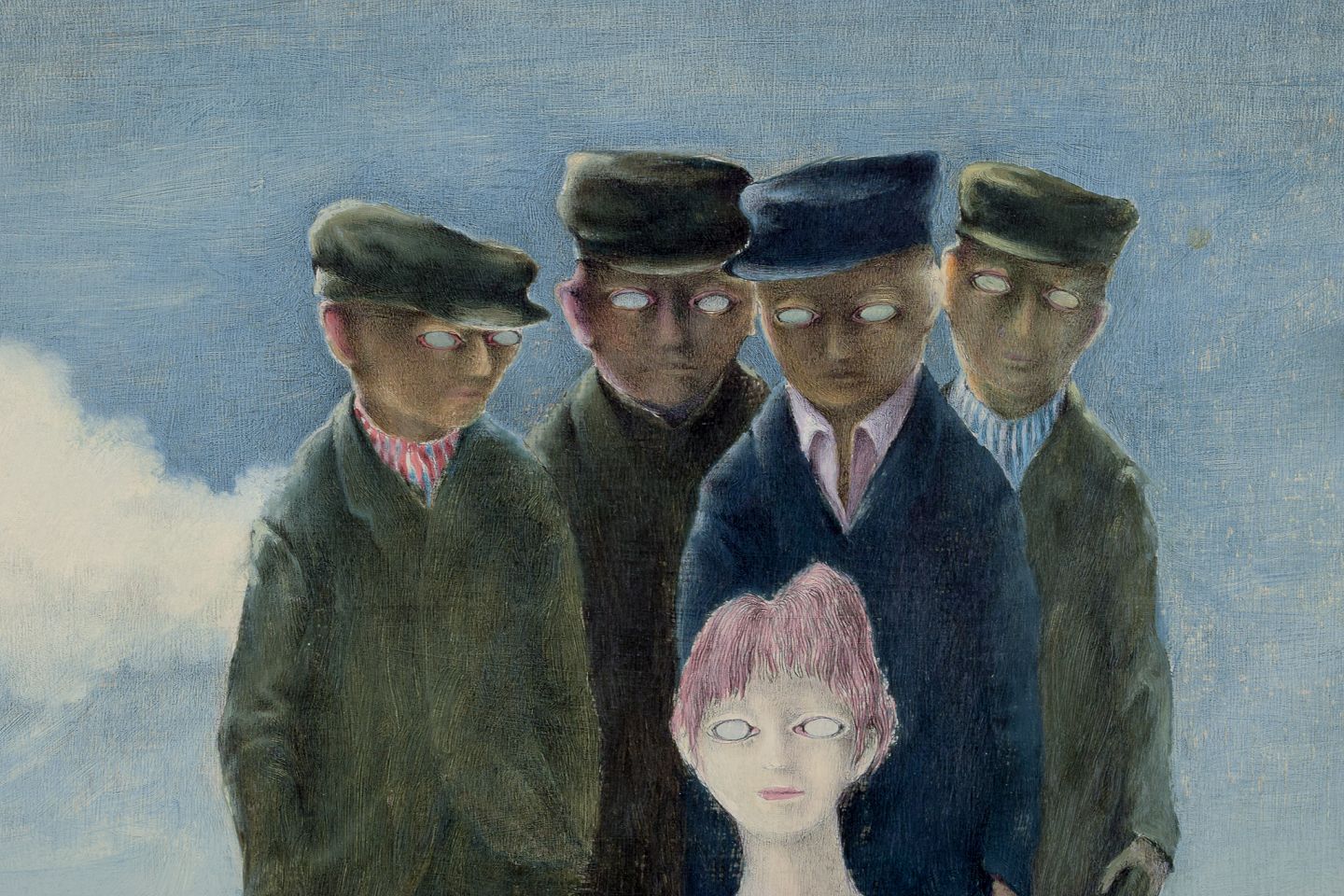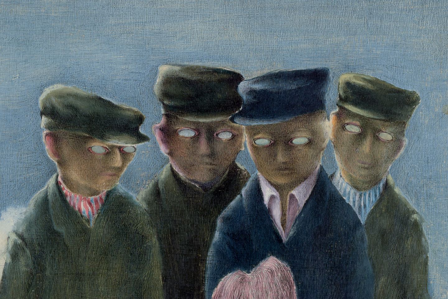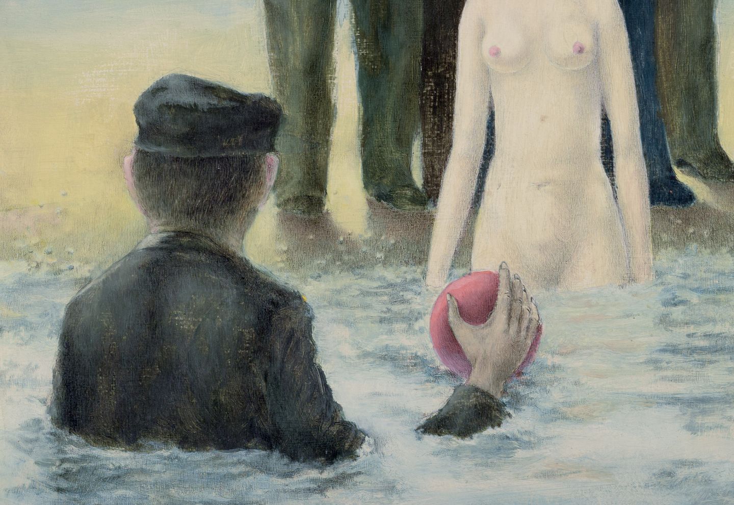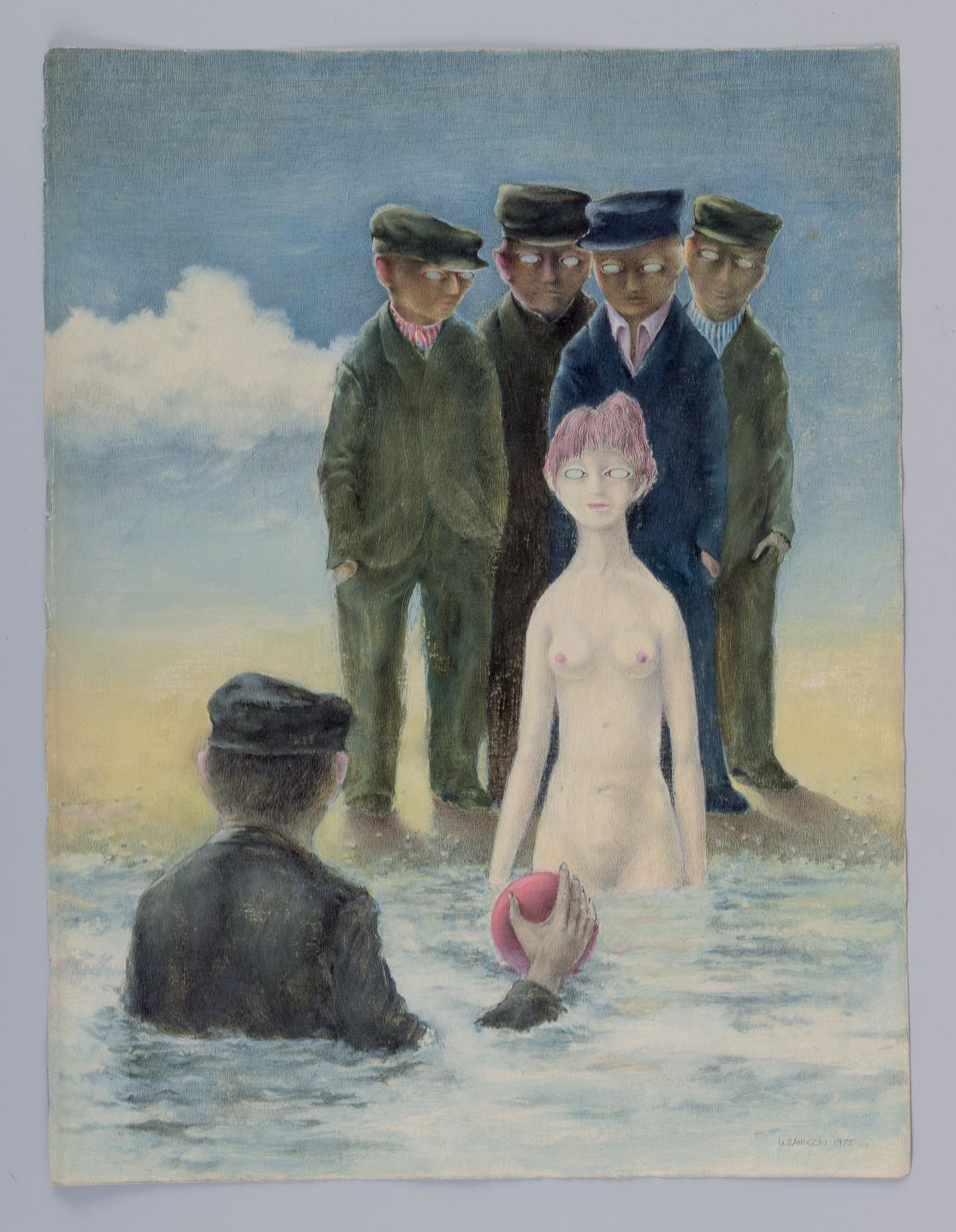 Uwe Bahnsen (1930-2013), Tysk kunstner. Olie på papir. Surrealistisk maleri med personer.