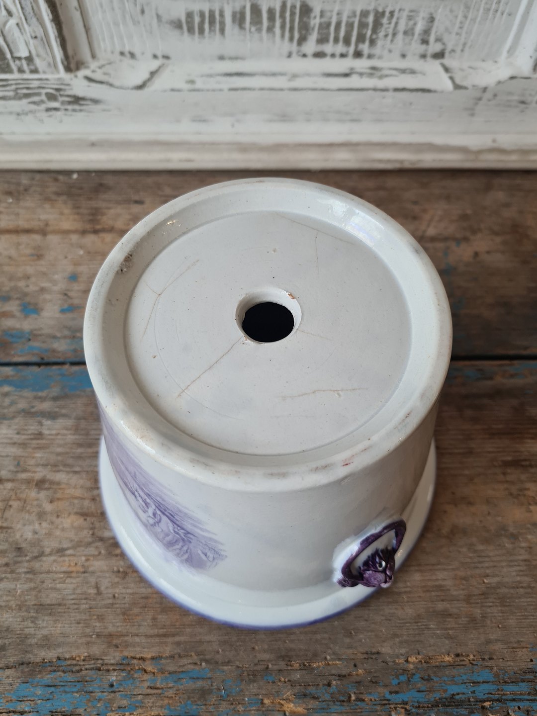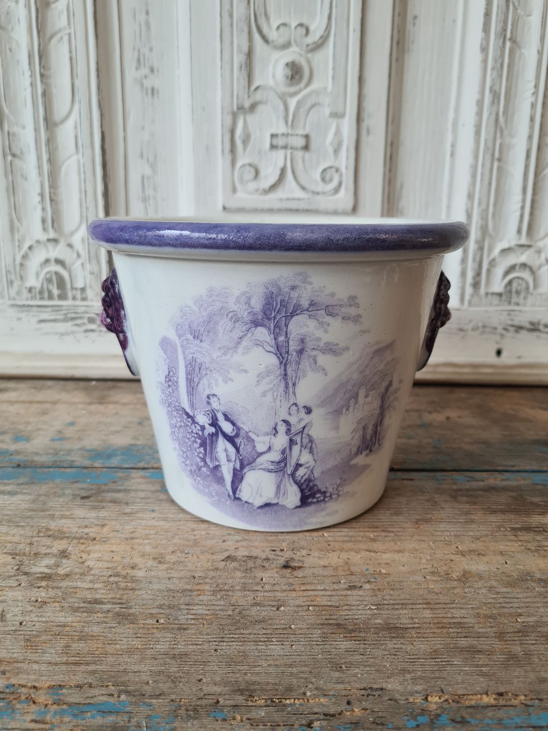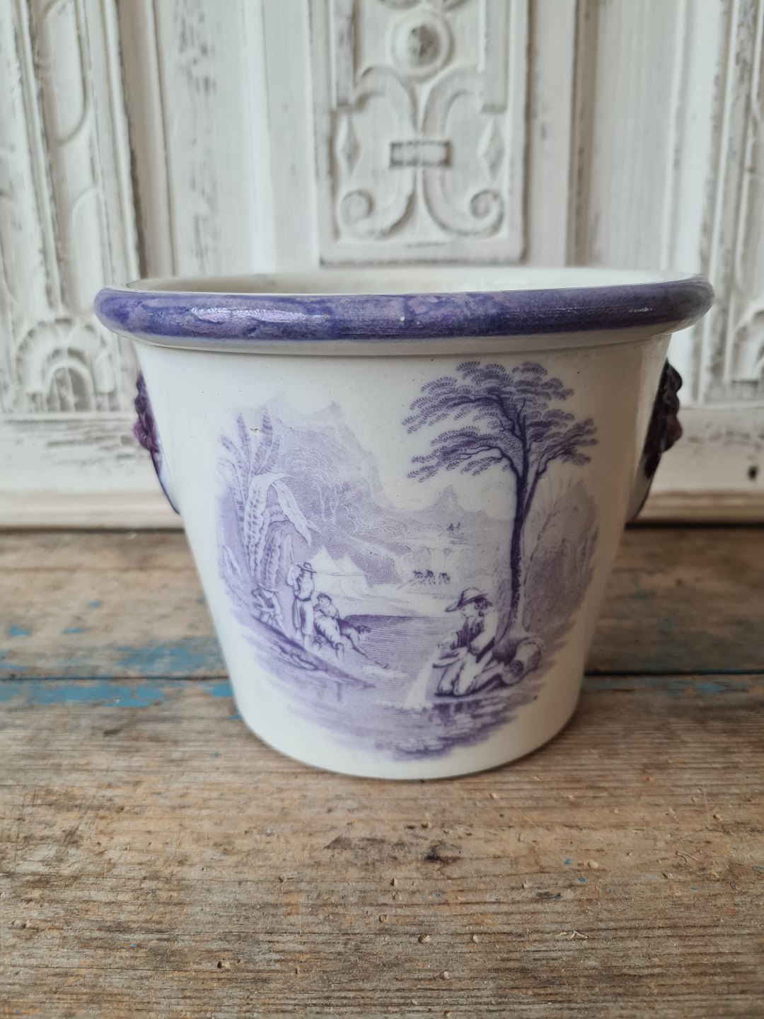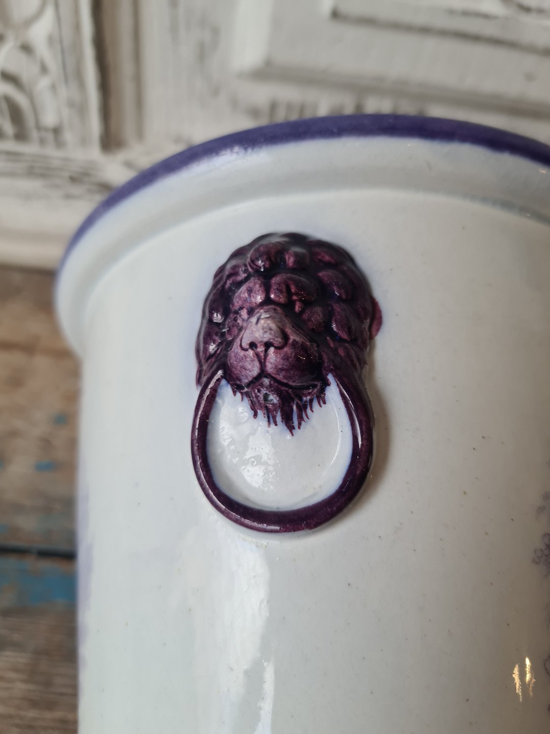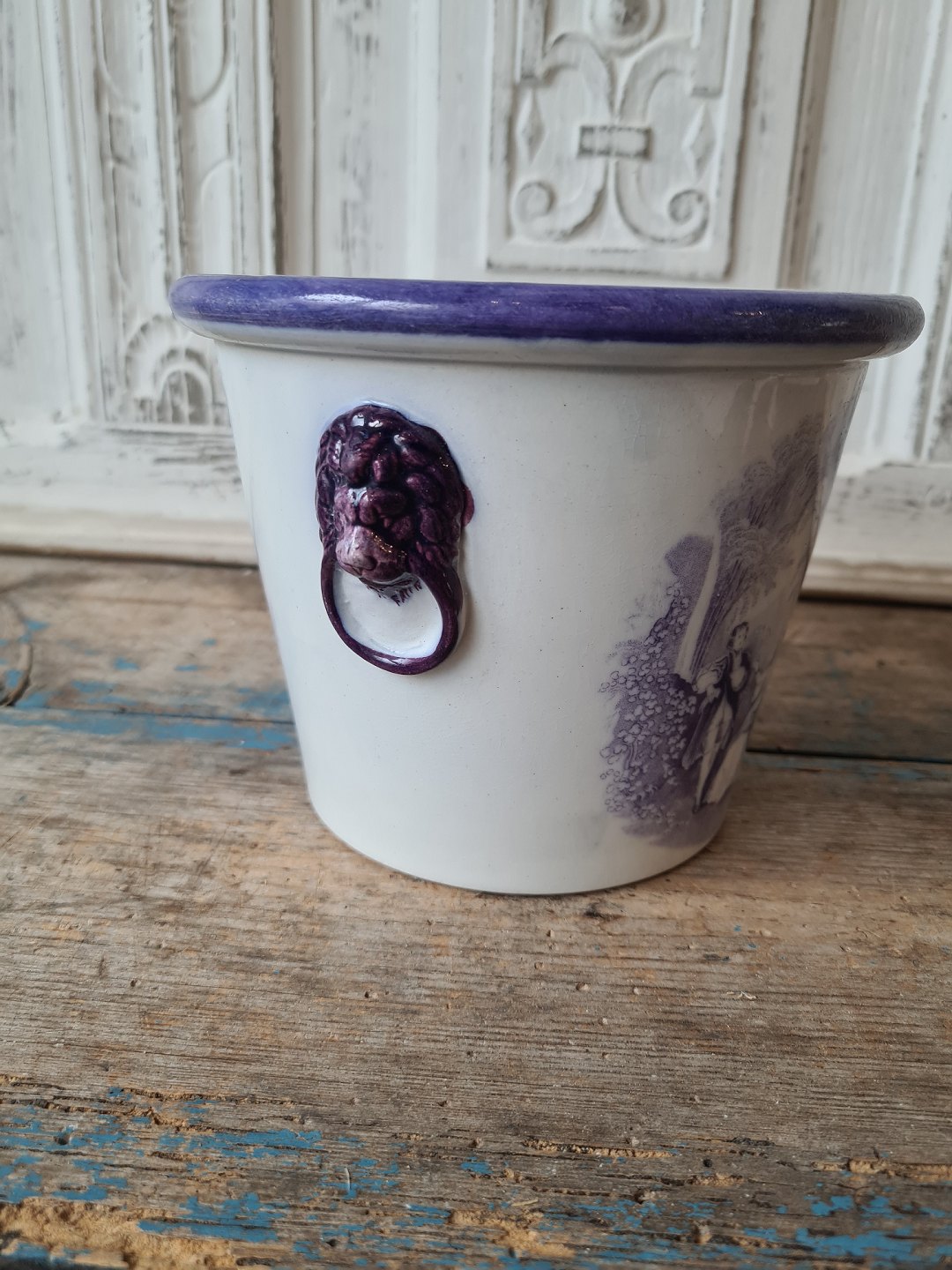 1800 tals engelsk fajance urtepotte med løvehoveder som hanke samt mangan farvet dekoration