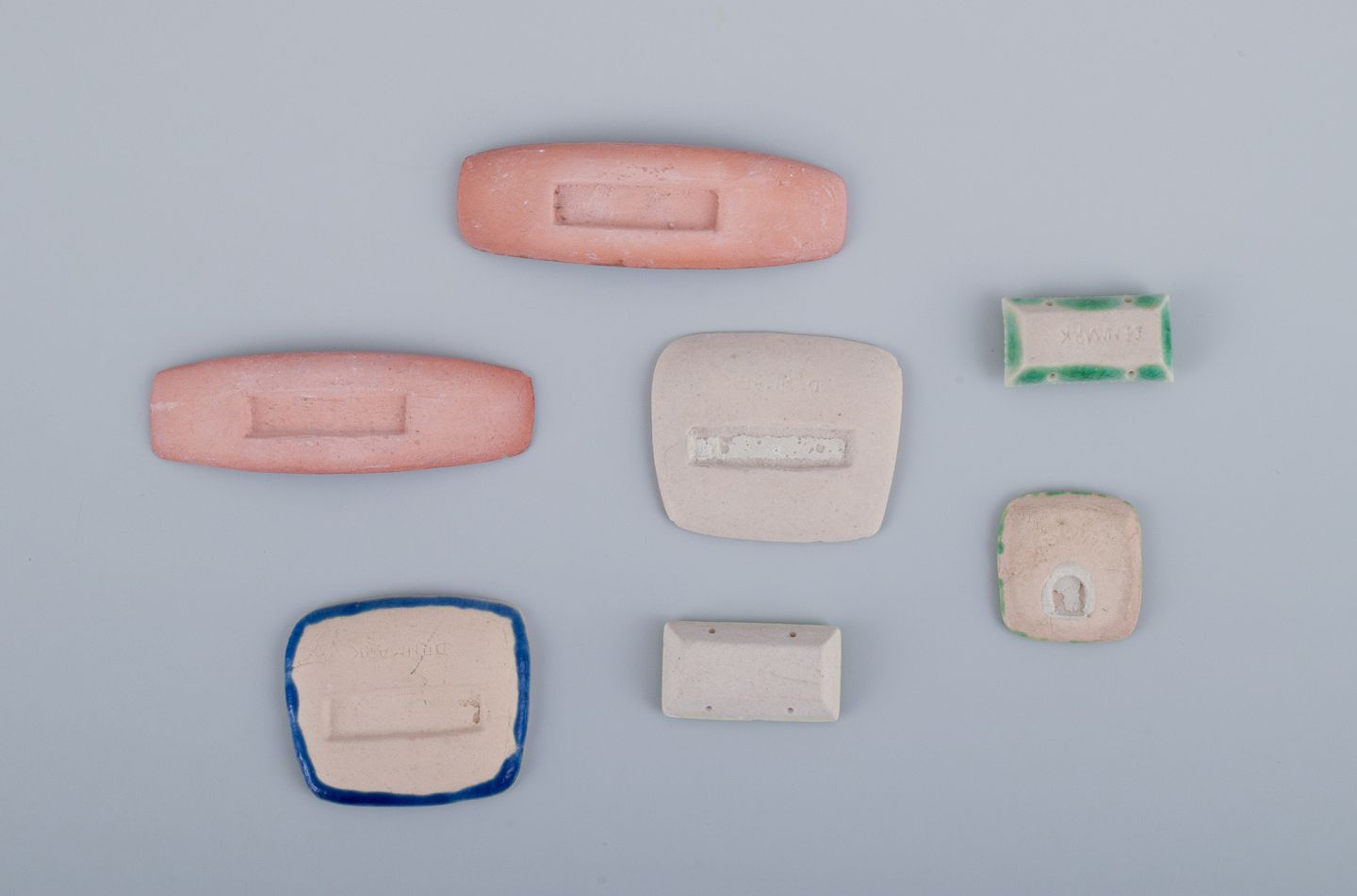 Ole Bjørn Krüger (1922-2007), dansk billedhugger og keramiker. Syv unika brocher i glaseret stentøj i blå og grønne nuancer.