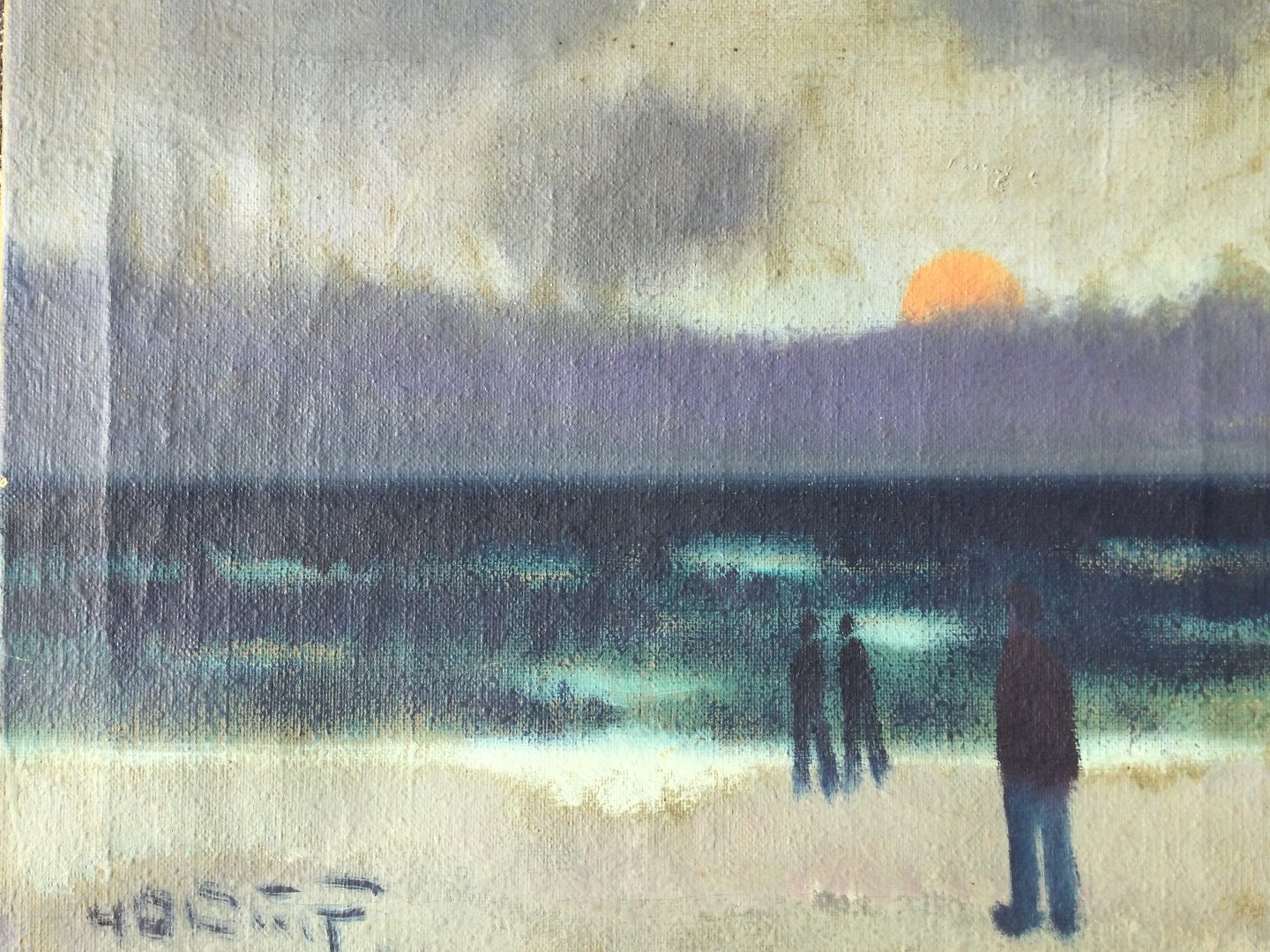 Text available in Danish: Maleri af Knud Horup - Solnedgang ved havet med personer på stranden.