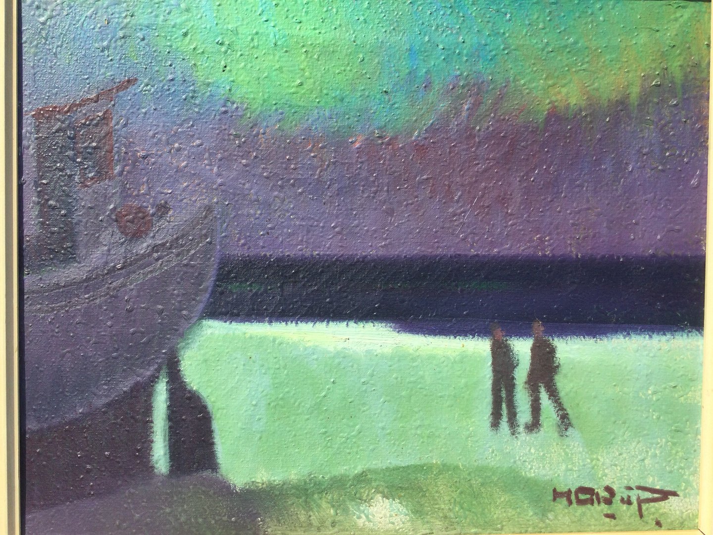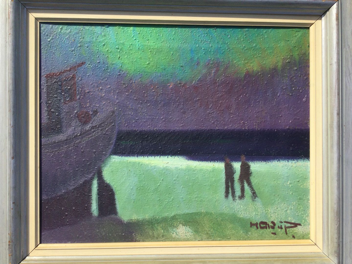 Maleri af Knud Horup - Strandparti med båd og person.