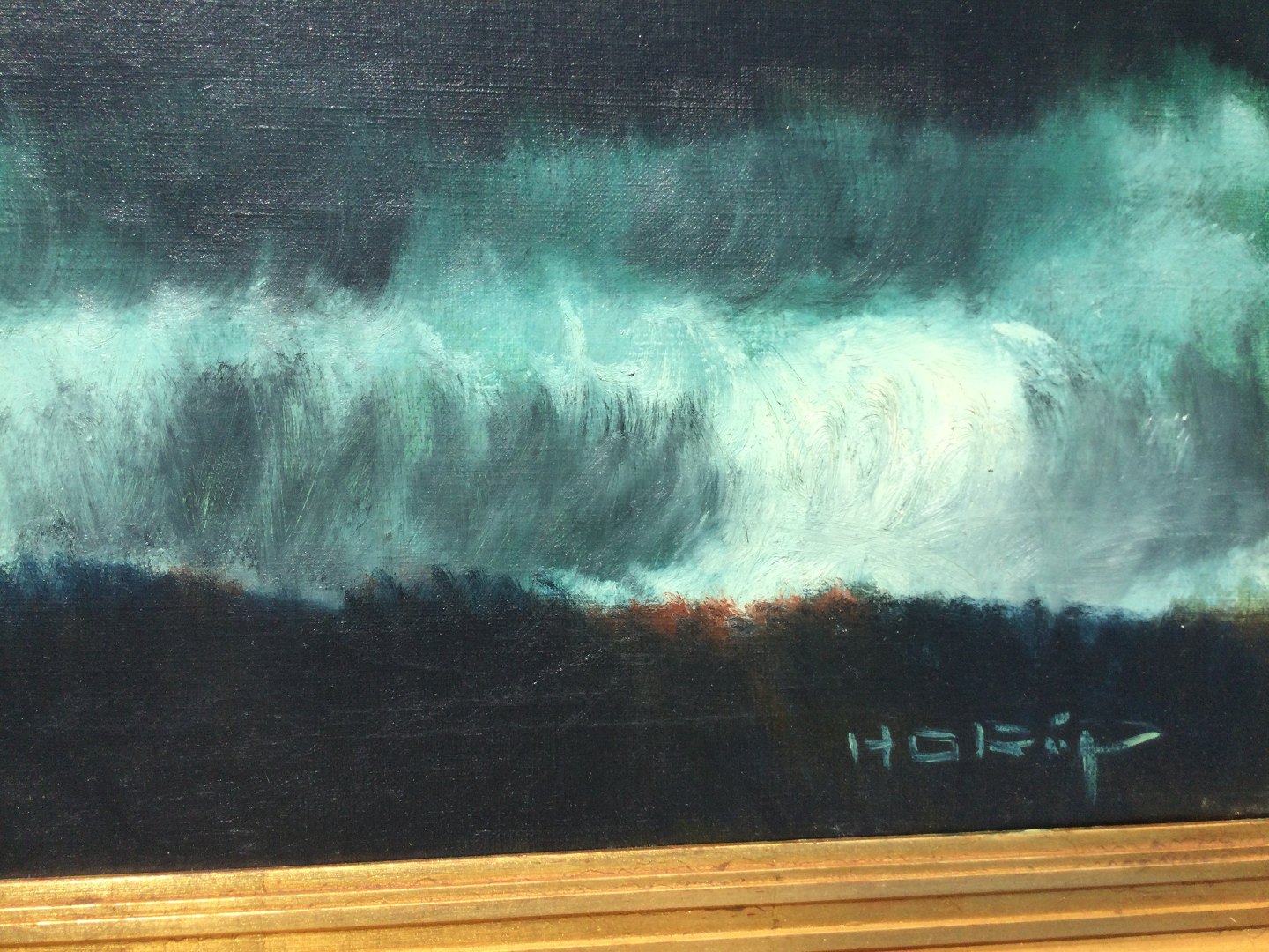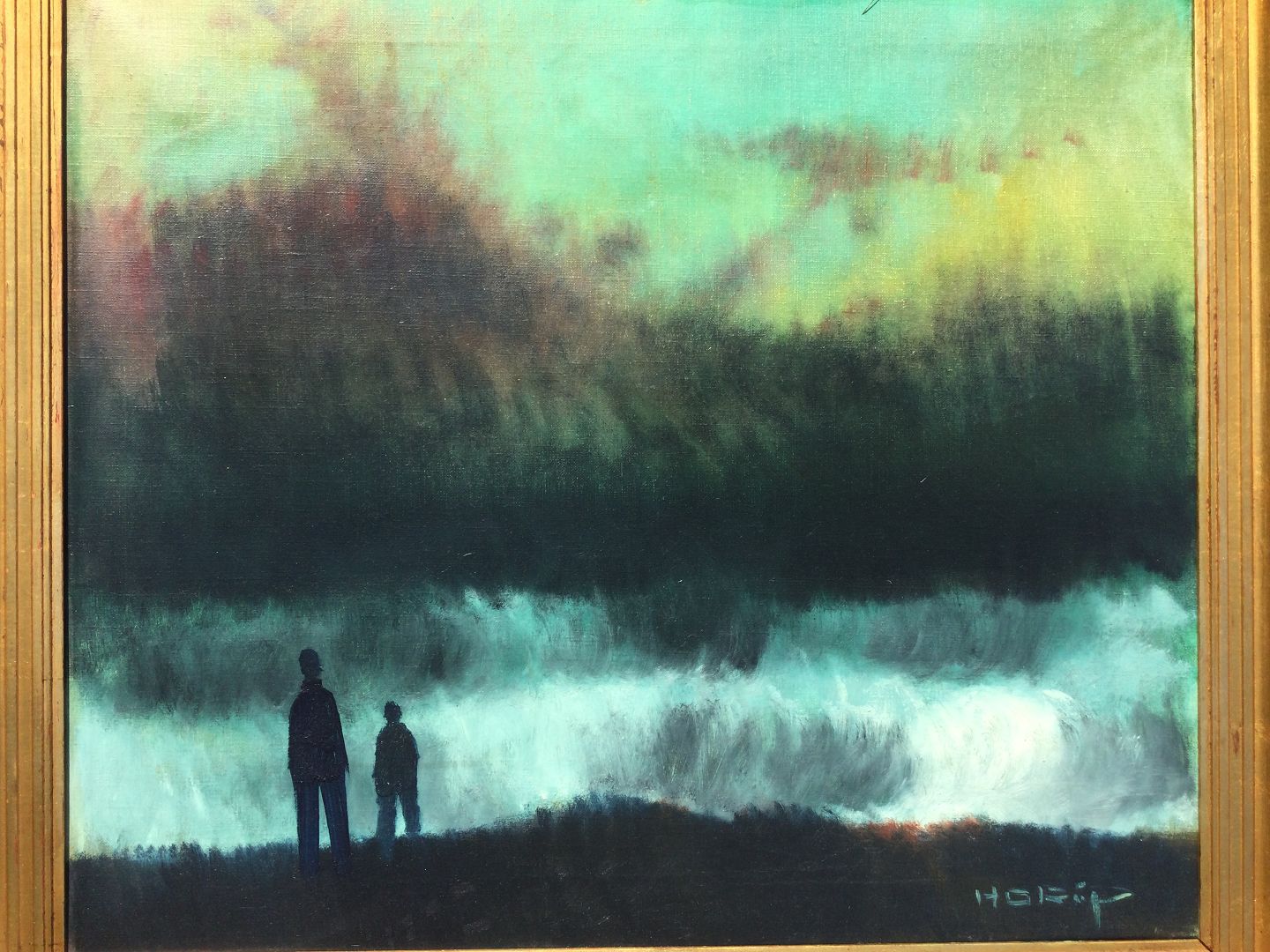 Maleri af Knud Horup - Personer ved oprørt hav.