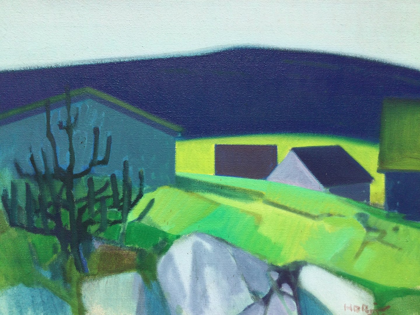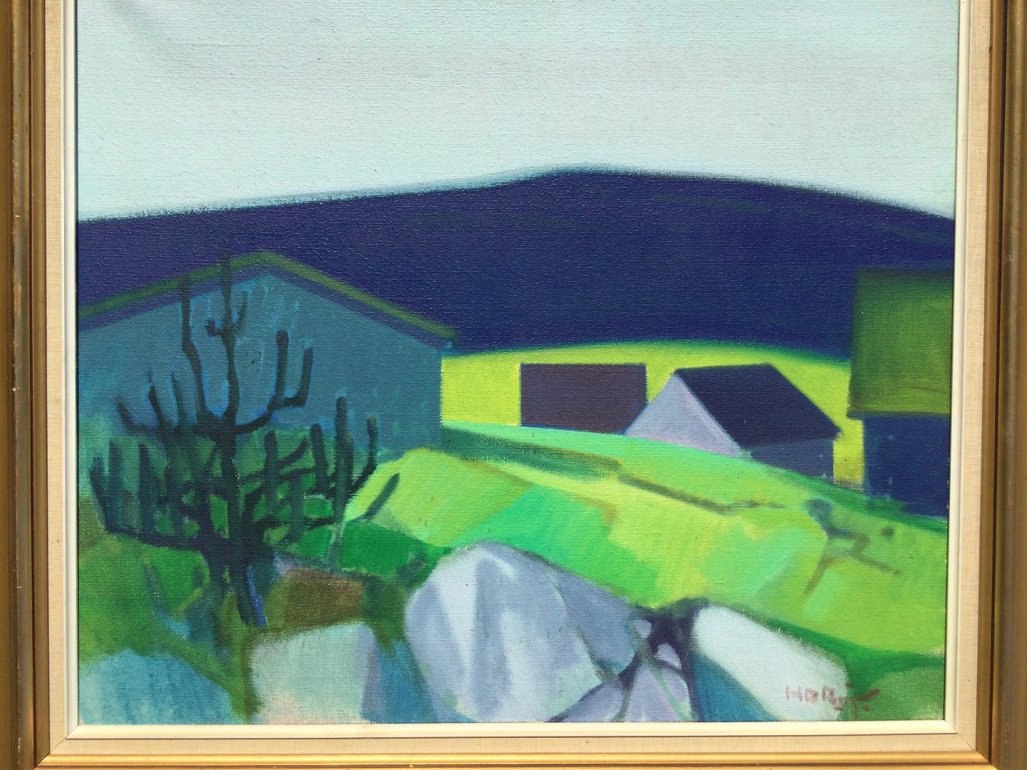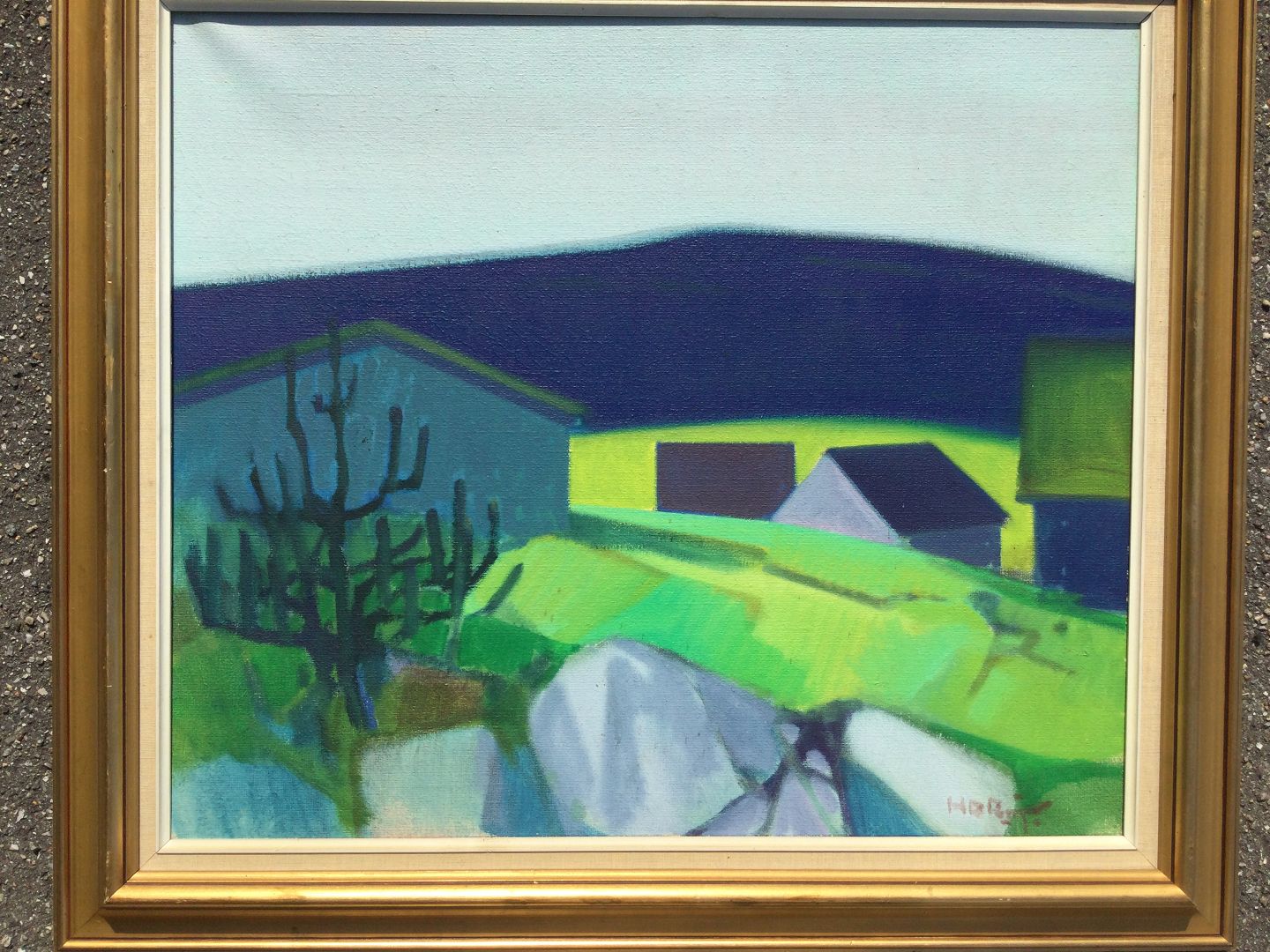 Maleri af Knud Horup - Grønt og blåt landskab med stendige og nøgent træ.