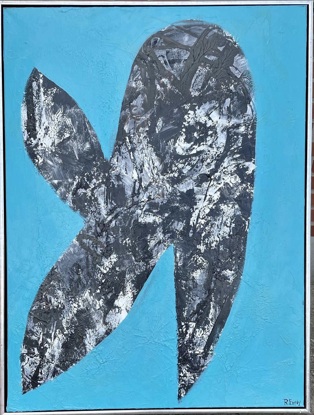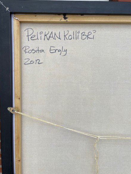 "Pelikan kolibri" akryl maleri på lærred i sølv svæveramme.
