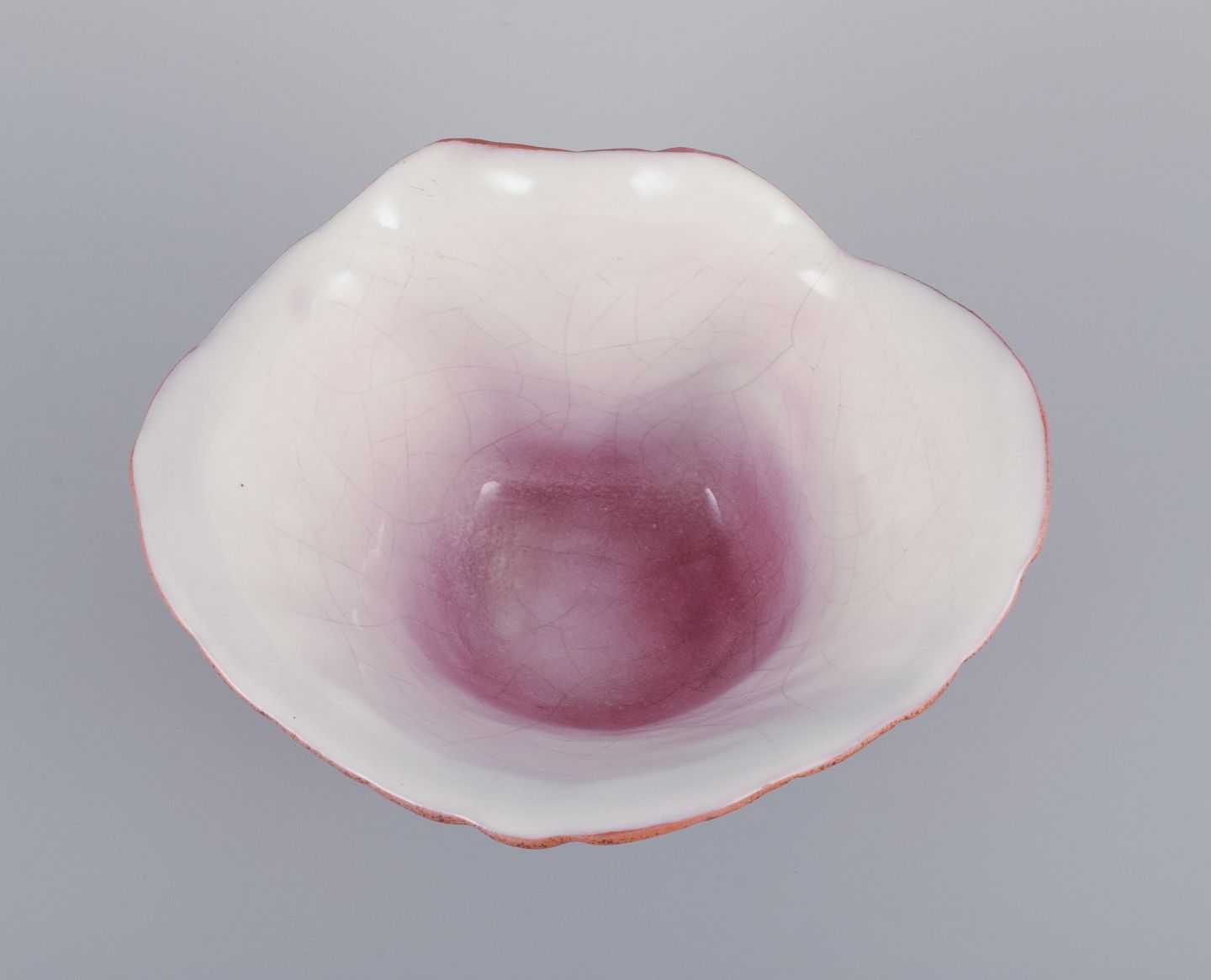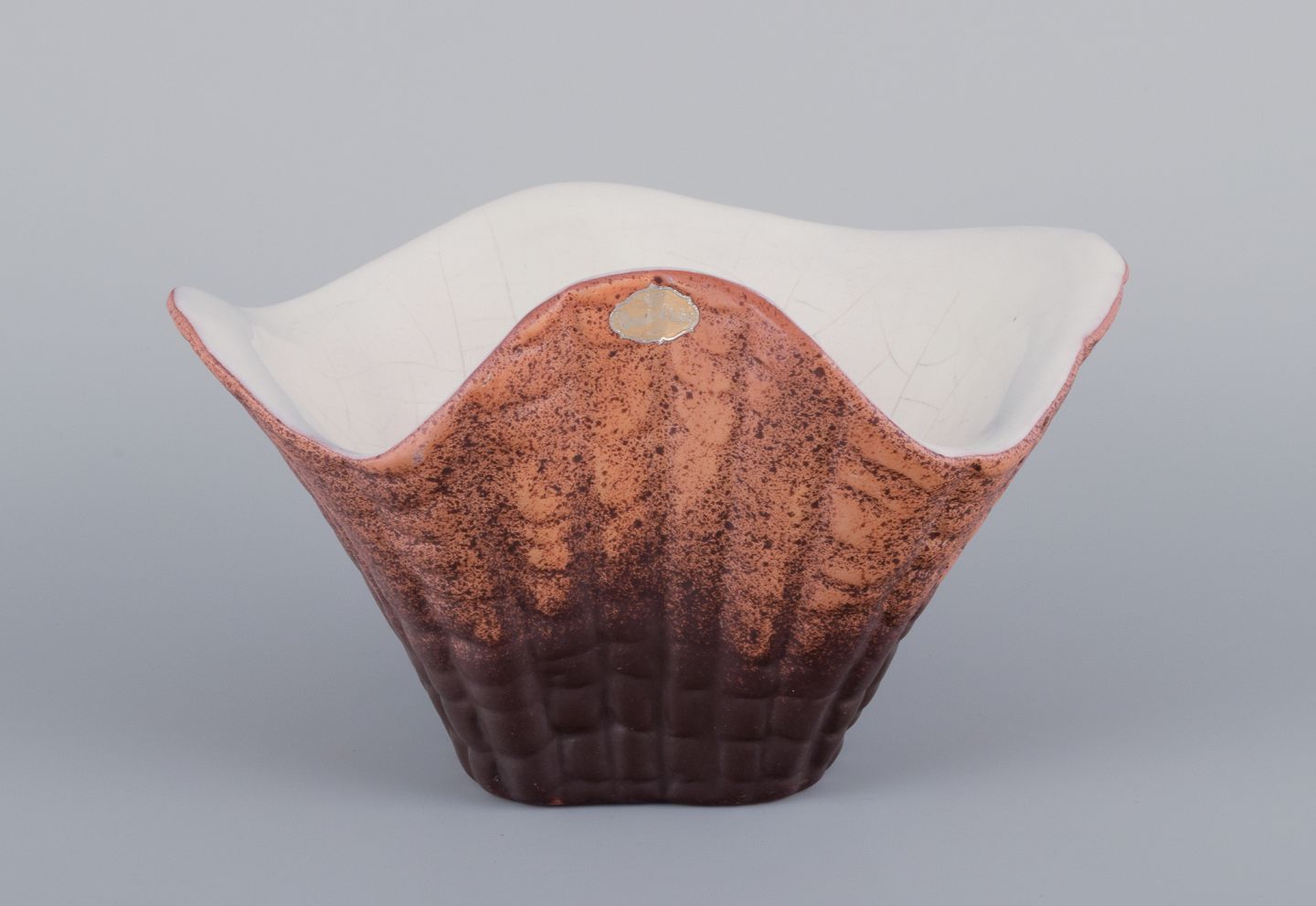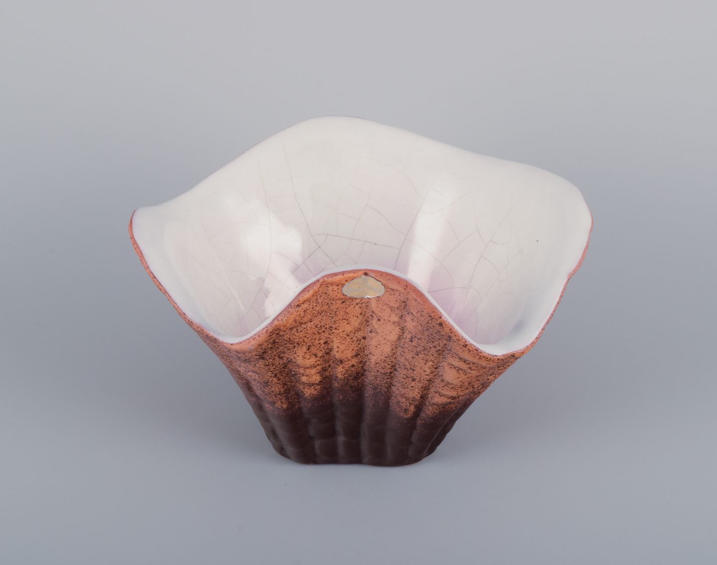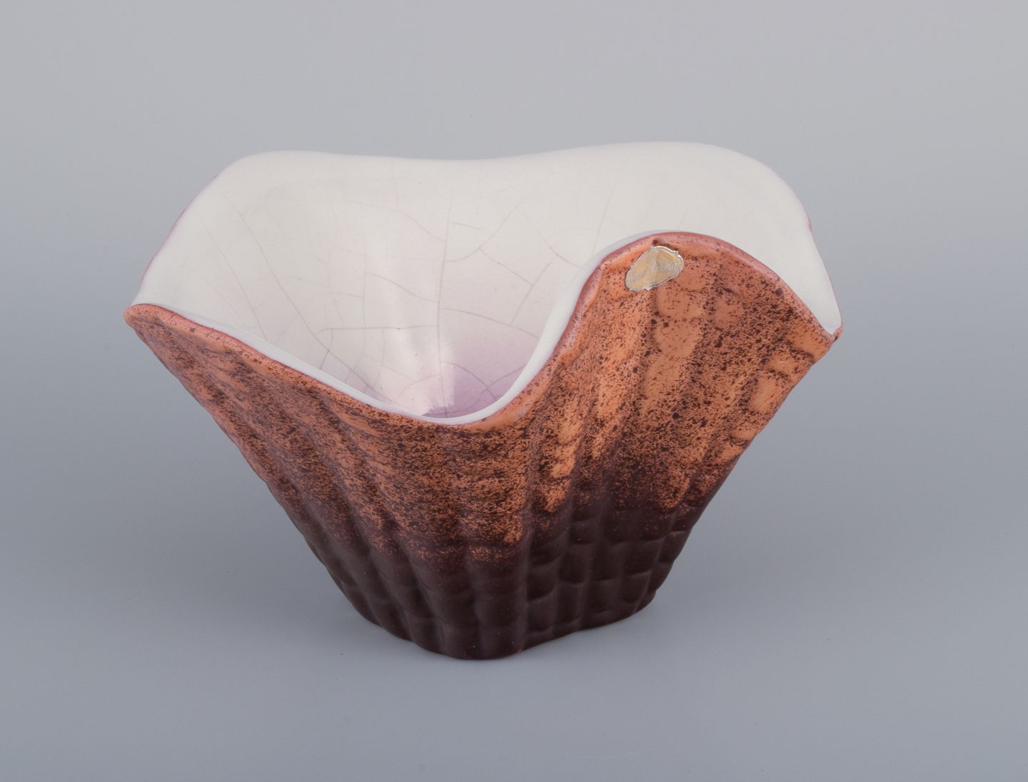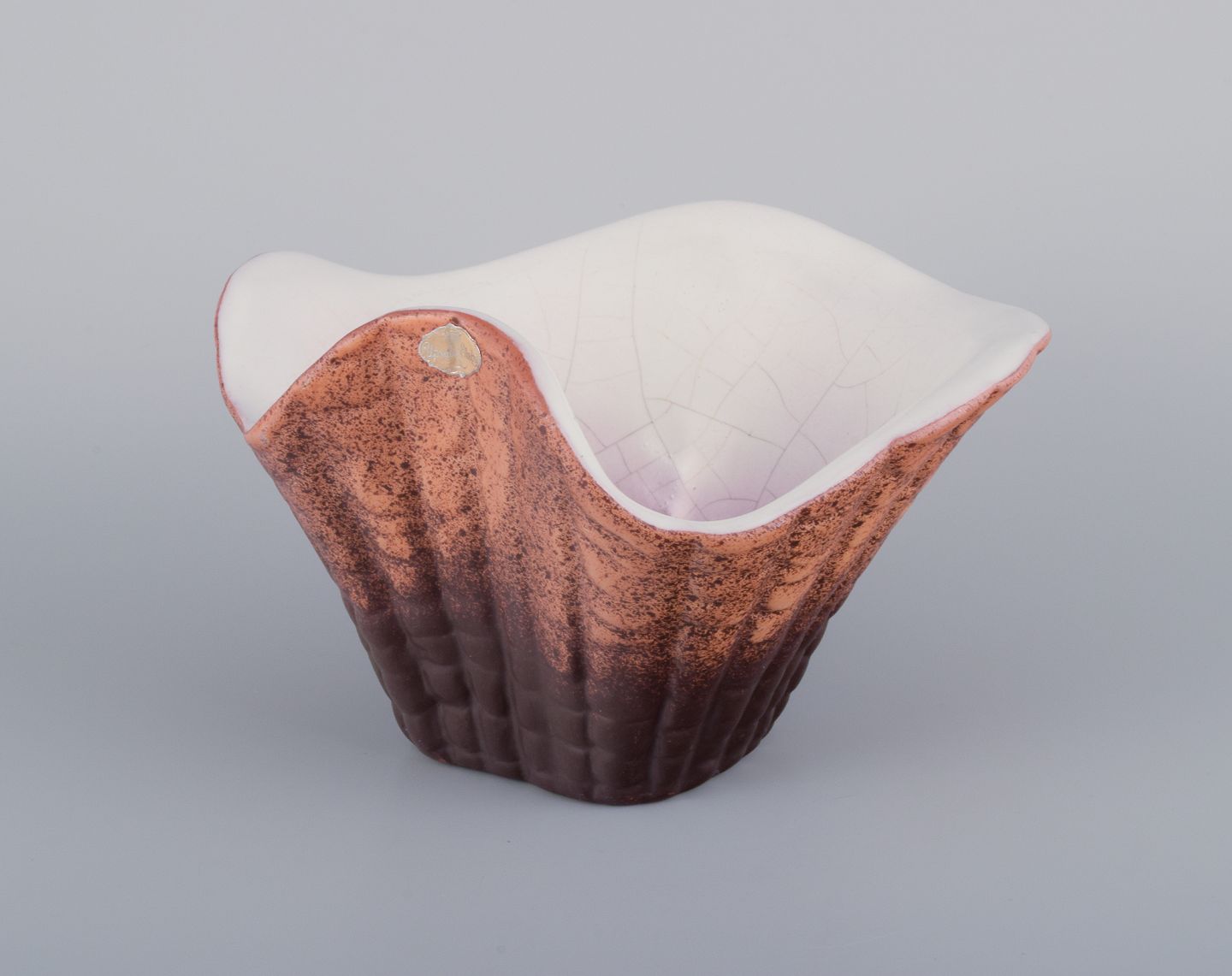 Snegleformet keramikskål. Glaseret i brune nuancer med lyserøde nuancer indvendigt.