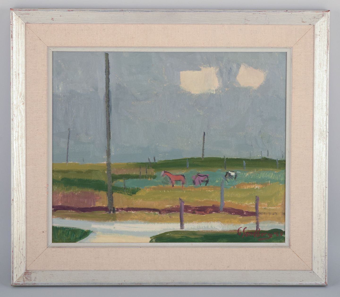 Gotthard Sandberg (1890-1961), Swedish artist, oil on board. Modernist landscape with horses in a meadow.