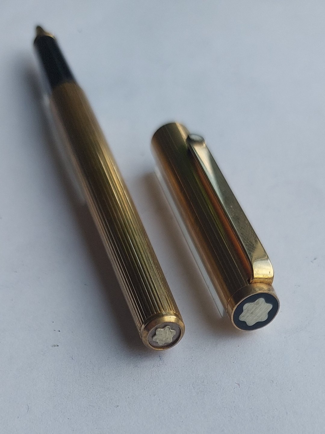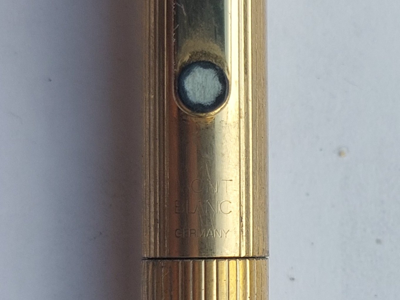 Slim Line eller S-line Montblanc kuglepen i guld double. Fremstillet i Tyskland. Fremstår i god stand uden skader eller reparationer. Den sorte refill, der sidder i virker - Indtil videre. Længde 14 cm.