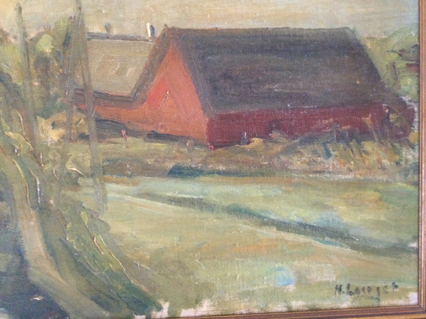 Maleri af Margrethe Loerges - Vej gennem by med telefonmaster.