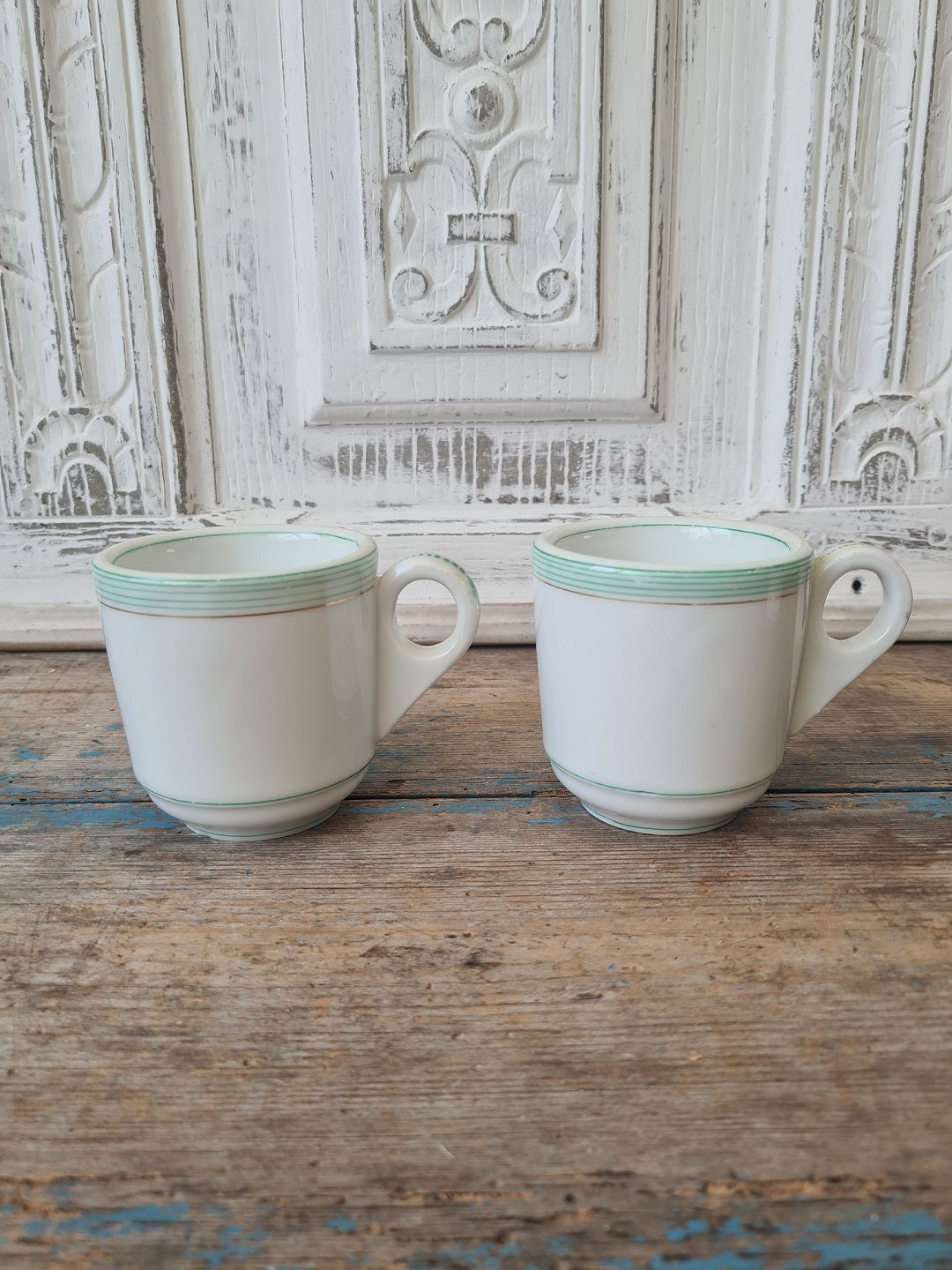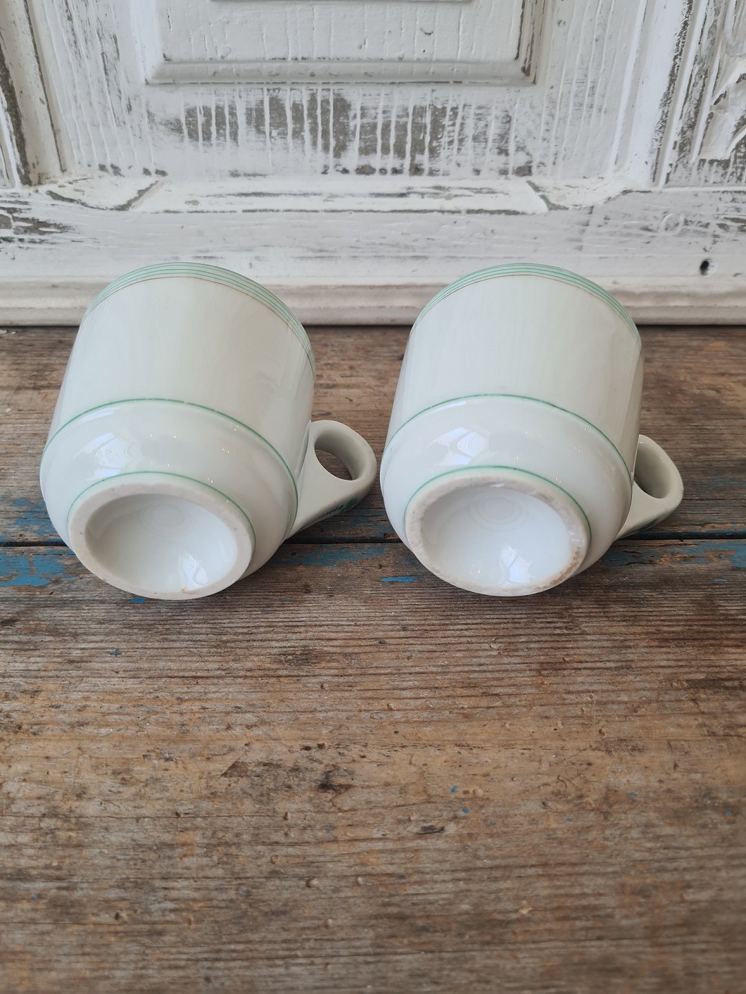 Par franske café brûlot kopper i kraftigt jern porcelæn dekoreret med grønne striber
