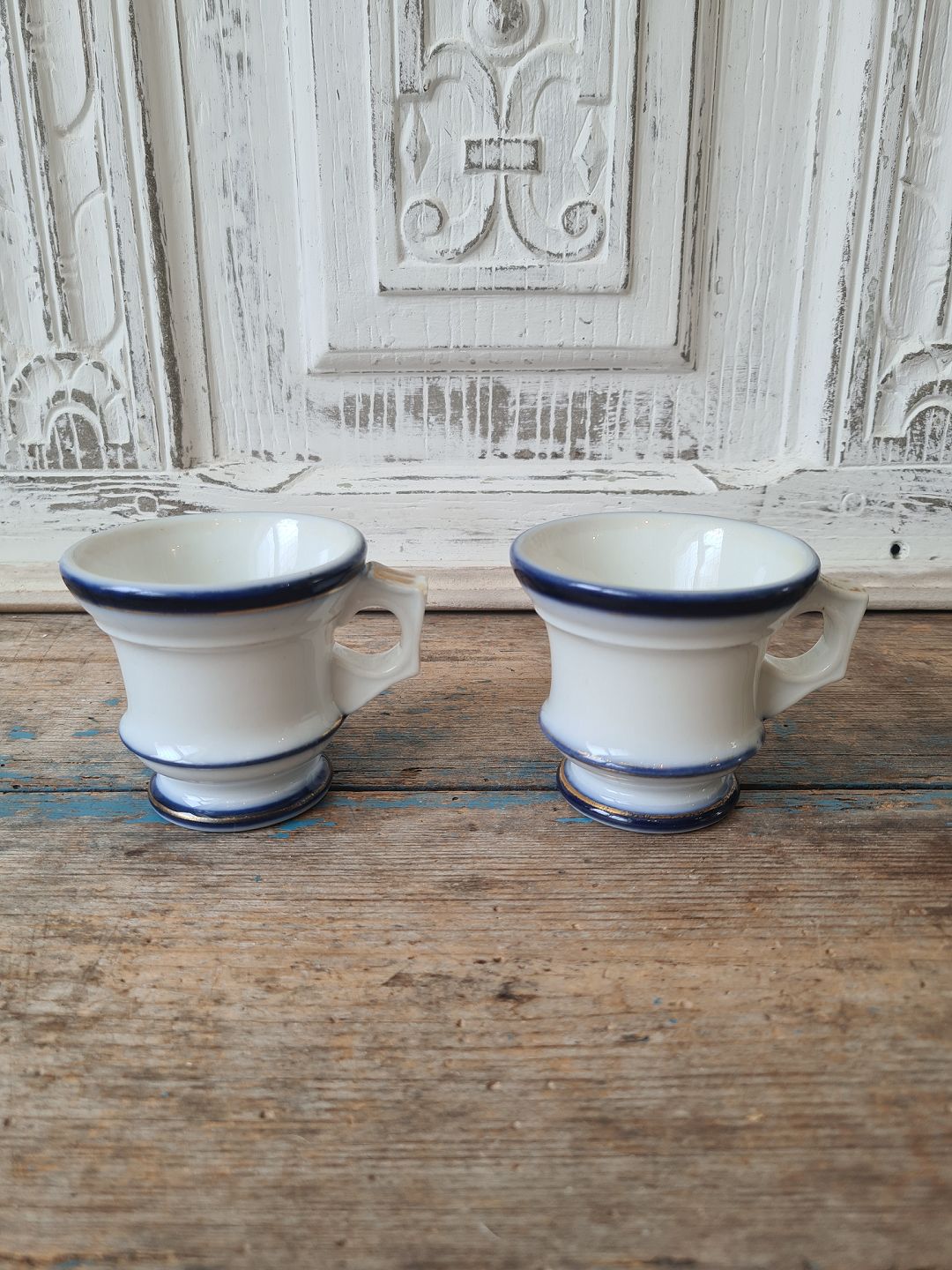 Par franske café brûlot kopper i kraftigt jern porcelæn dekoreret med blå striber