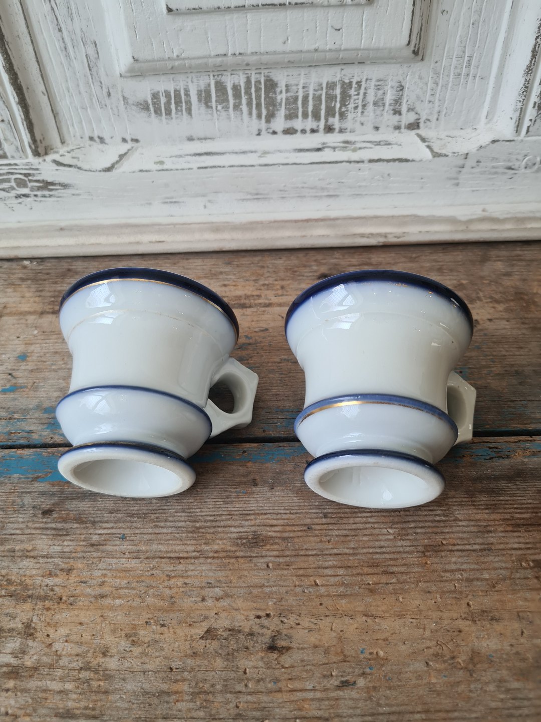 Par franske café brûlot kopper i kraftigt jern porcelæn dekoreret med blå og guld striber