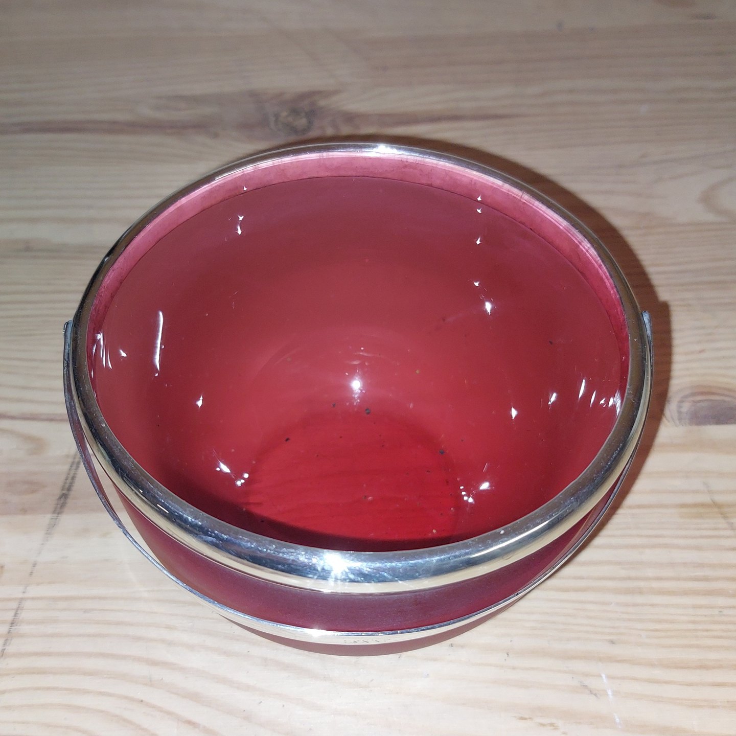 Sukkerskål i rosa glas med hank i sølvplet. Både glasskålen og hanken i god stand uden brugsspor. Ydersiden mat-slebet. Fremstillet omkring 1900. Mål: H. 7½ cm (2.95 tommer) Ø. 12 cm (4.72 tommer