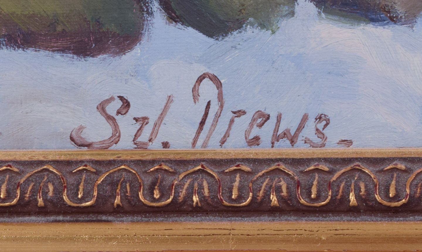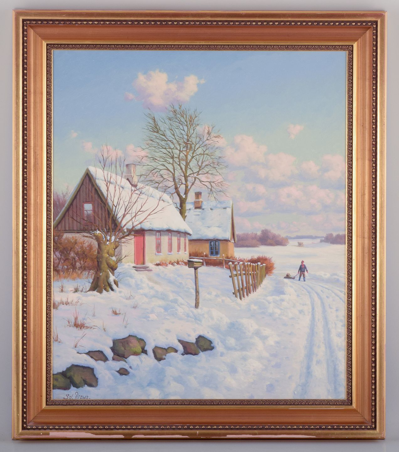 Svend Drews, oil on canvas. Danish idyllic winter landscape.