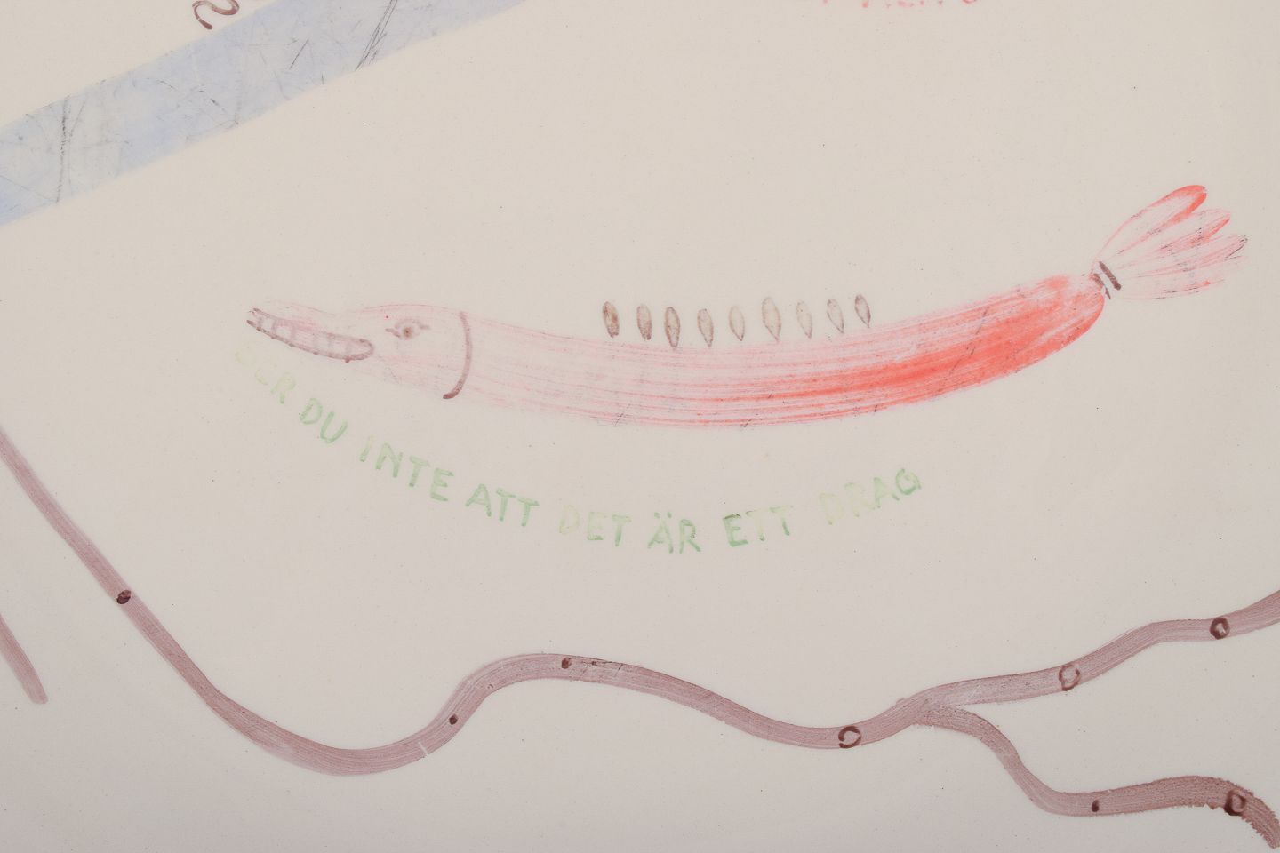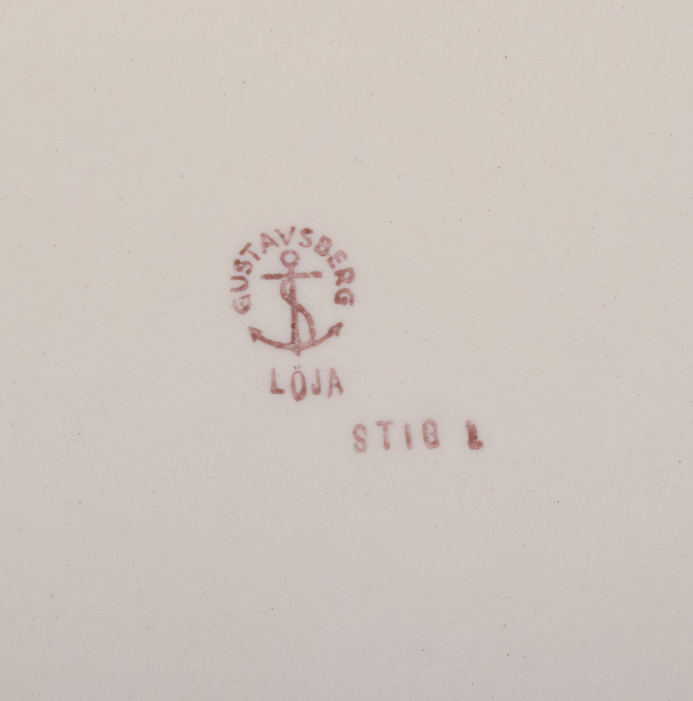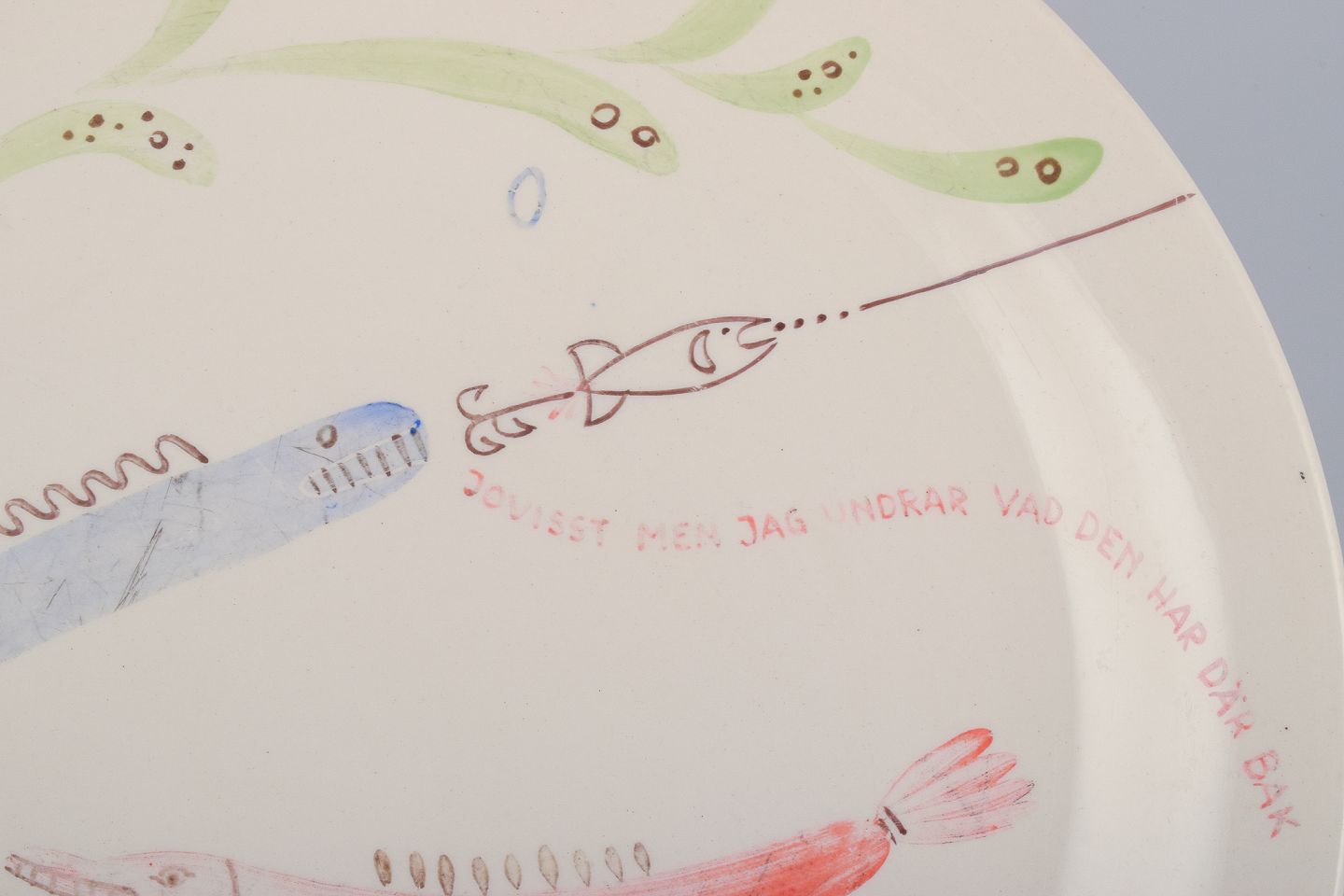 Stig Lindberg for Gustavsberg. "Löja" tallerken. Håndmalet med fiskemotiv. Satirisk motiv med svensk tekst.