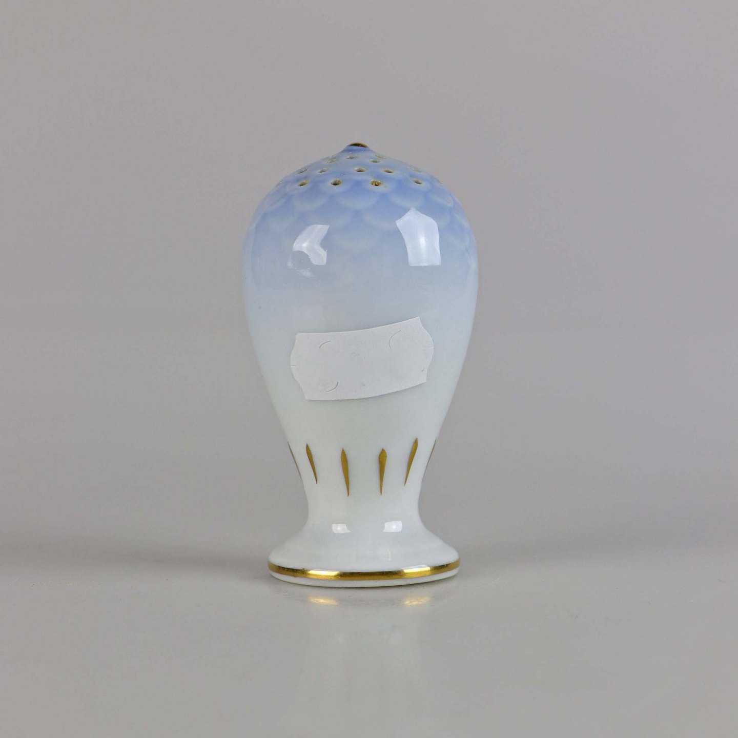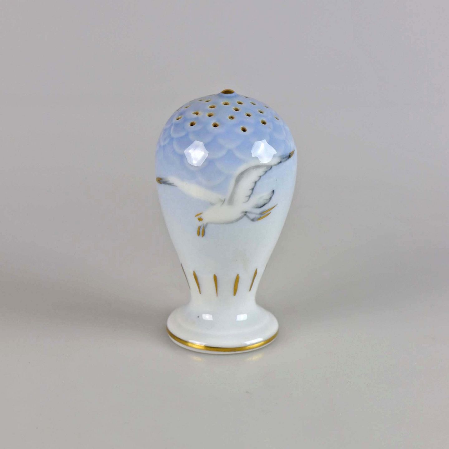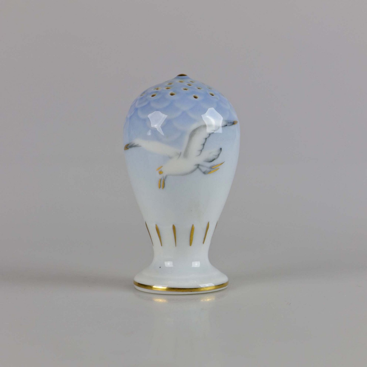 Saltstrøer af porcelæn i blålige farver med motiv af måger og guldstreger