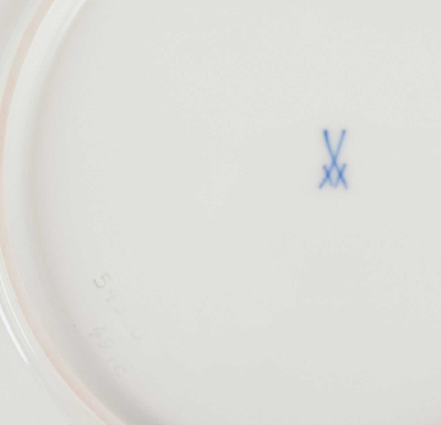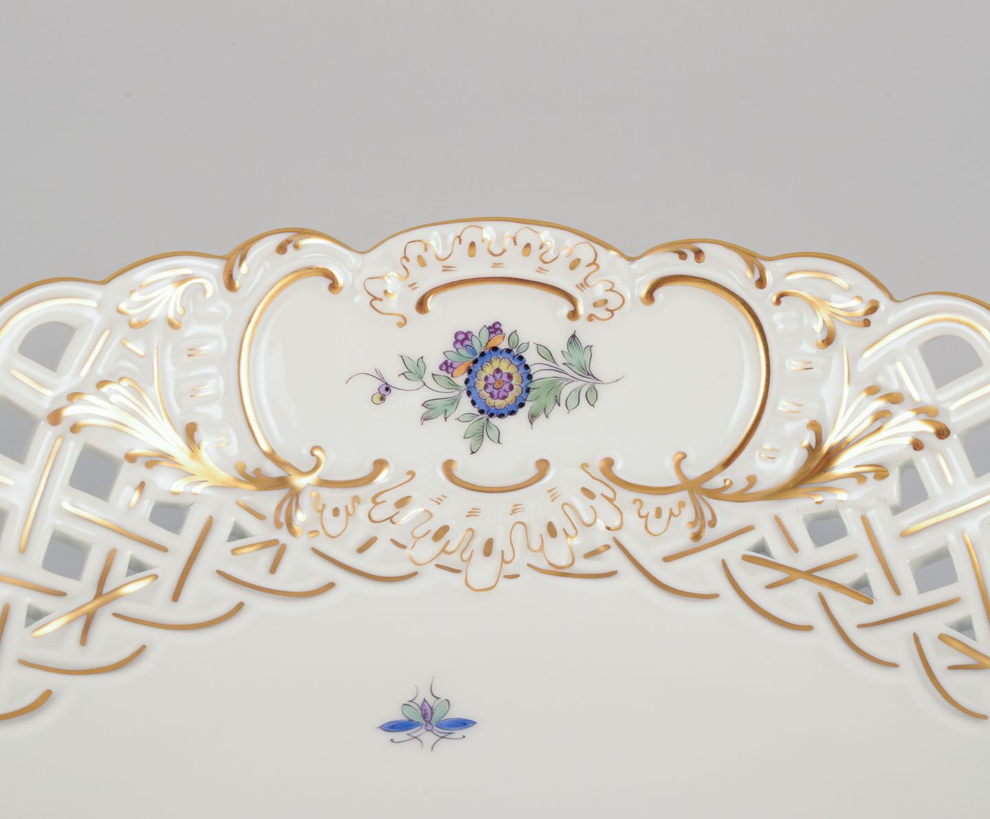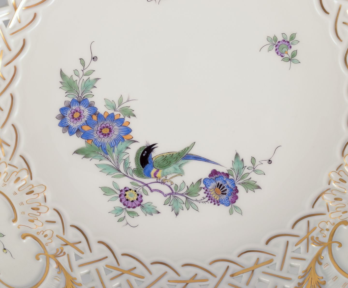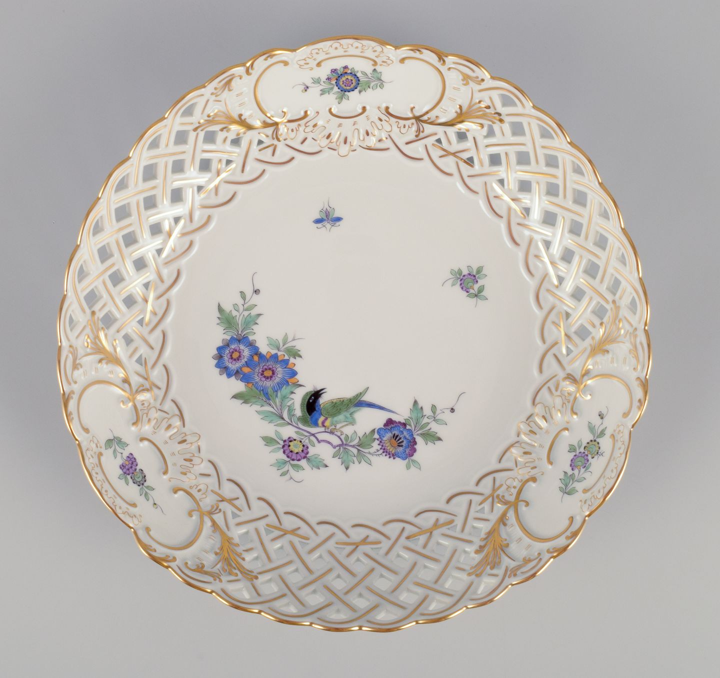 Meissen, Tyskland. Gennembrudt skål i porcelæn dekoreret i guld og med eksotisk fugl på blomstergren. Håndmalet.